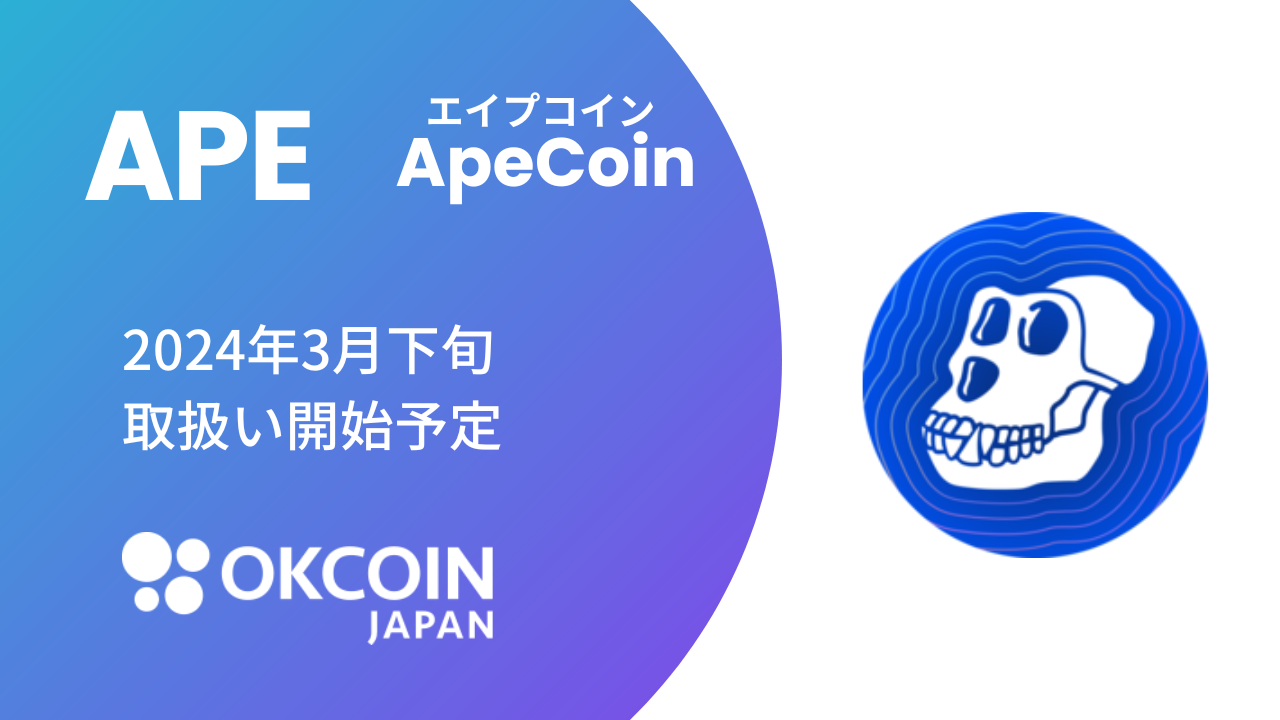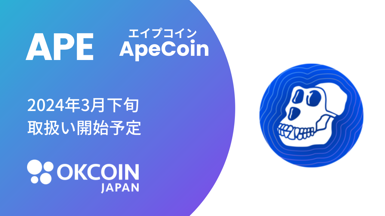 当社は、OKCoinJapan(暗号資産取引所)にて、『エイプコイン(APE)』を、2024年3月下旬に取扱い開始予定であることをお知らせいたします。これにより、OKCoinJapanは、38種類の暗号資産を取扱うことになります。