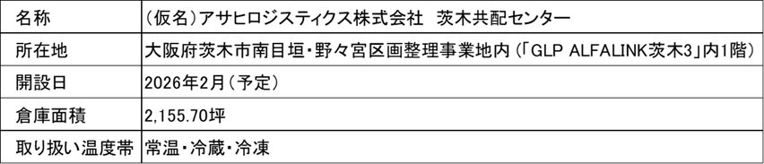 1,600台のトラックと2,500人超のドライバーで毎日500万人の食生活を支える物流インフラ企業、アサヒロジスティクス株式会社(埼玉県さいたま市大宮区/代表取締役社長 横塚 元樹)は、2026年2月(予定)、大阪府茨木市に物流センターを新規開設いたします。関西での配送・倉庫の両機能を持つ物流センターの開設は、当社では初※1となります。1月28日にアサヒロジスティクス株式会社は設立70周年を迎えました。新たなステップとして「次の10年に向けて東日本から中部・関西もカバーできる体制を構築する」ことを目指し、東日本と関西を結ぶ機能を構築することで、安定した物流の提供に幅広く貢献することを目的としております。