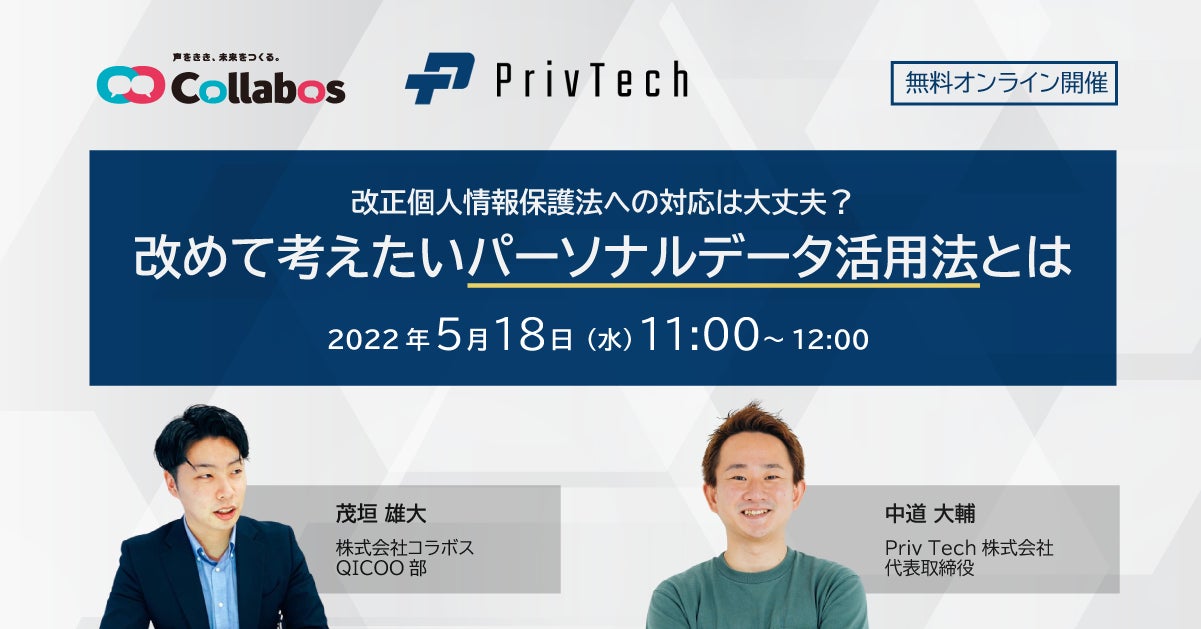 Priv Tech株式会社(本社:東京都新宿区、代表取締役:中道 大輔、以下Priv Tech)と株式会社コラボス(本社: 東京都墨田区、代表取締役社長: 茂木 貴雄、以下コラボス)は共同で、無料オンラインセミナー「改正個人情報保護法への対応は大丈夫?改めて考えたいパーソナルデータ活用法とは」を2022年5月18日(水)11時より開催いたします。