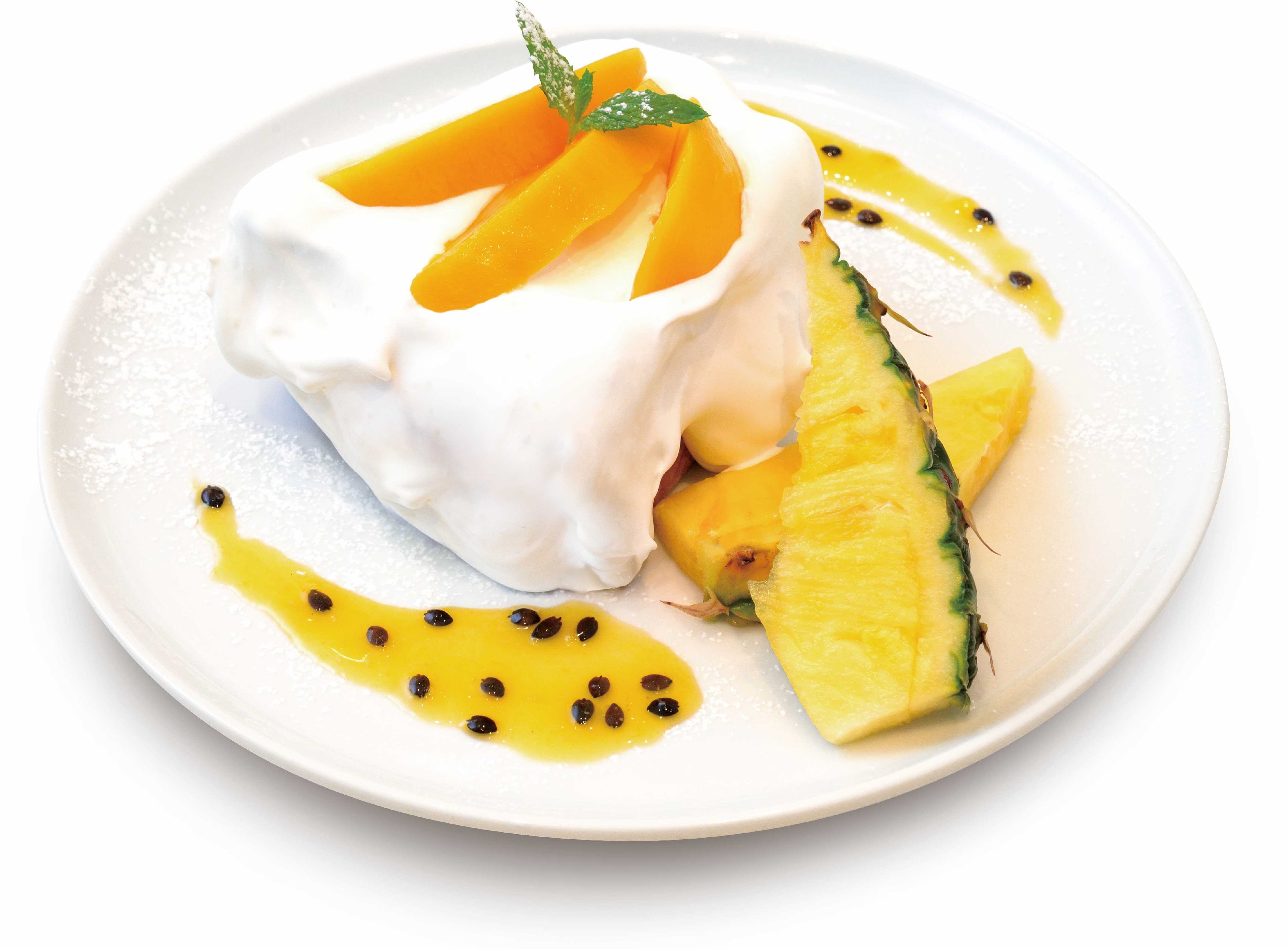 フレンチトーストにたっぷりのマスカルポーネクリームと、フレッシュマンゴーとフレッシュパインをのせた南国気分になれる一品。パッションフルーツソースの酸味が味を引き締めます。