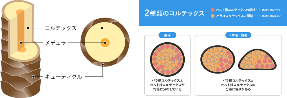 2層目にあるコルテックスが水を通しやすい「オルト様コルテックスの部分」と水を通しにくい「パラ様コルテックスの部分」の2つが存在します。髪が水分を含んだとき、水を通しにくいパラ様コルテックスの部分はあまり形状が変わりませんが、水を通しやすいオルト様コルテックスの部分は膨張します。