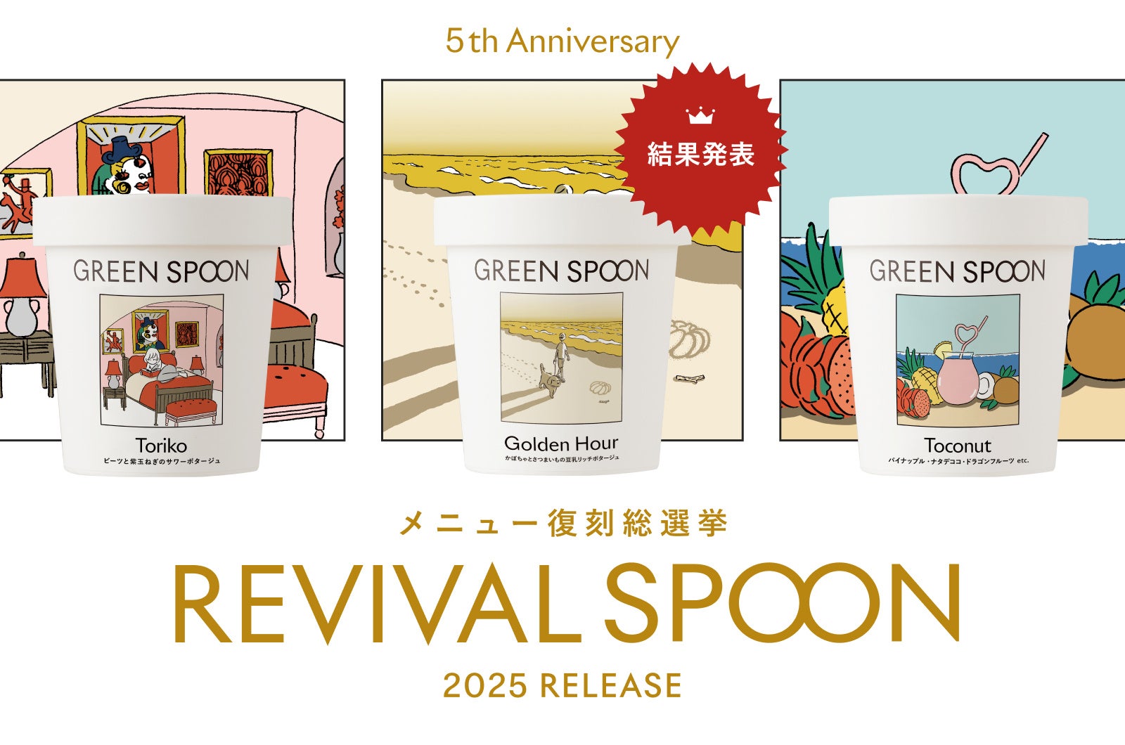 たっぷり野菜のヘルシーおうちごはん「GREEN SPOON(グリーンスプーン)」を企画・製造・販売する株式会社Greenspoon(本社:東京都渋谷区、代表取締役CEO:田邊友則)は、ブランド5周年を記念して「メニュー復刻総選挙」を開催しました。総投票数は18,255票となり、スープ、メインディッシュ、スムージーから合計3メニューが復刻商品として選ばれました。2025年8月より3ヶ月連続でGREEN SPOON公式サイトにて販売される予定です。
