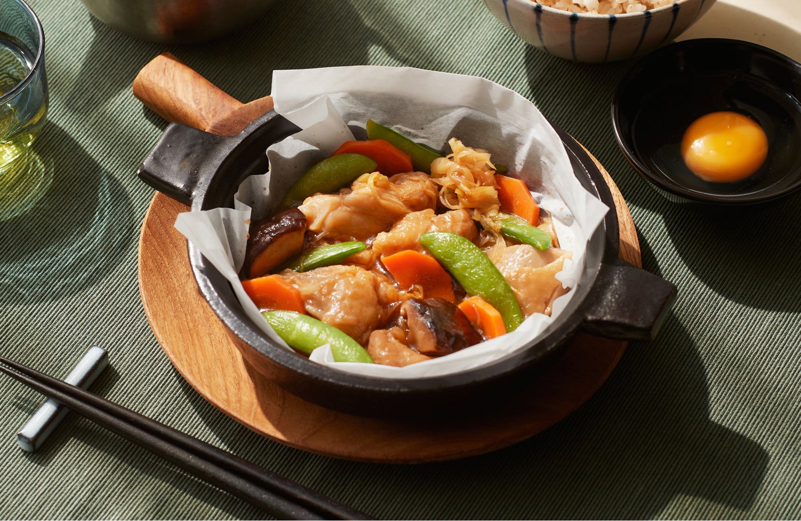 2023年発売の、甘辛いすき焼き鍋を紙包みで再現した王道人気メニュー。和風出汁がジューシーな鶏肉やしいたけに染み込んだ、白ごはんによく合う一品です。