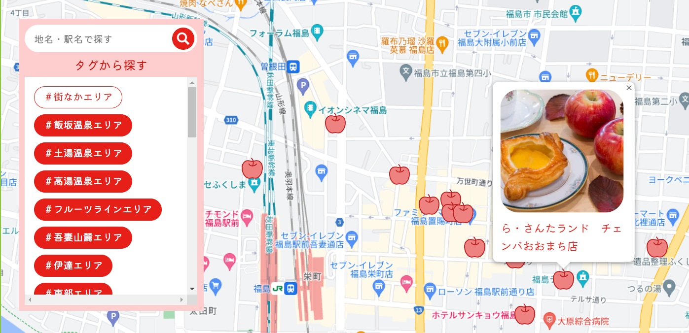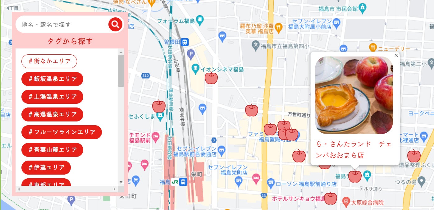 また、サイトには福島全域の参加店を俯瞰で把握することができる参加店マップを設置しました。土地勘のない訪問客でも、気軽に参加店巡りを楽しむことができます。