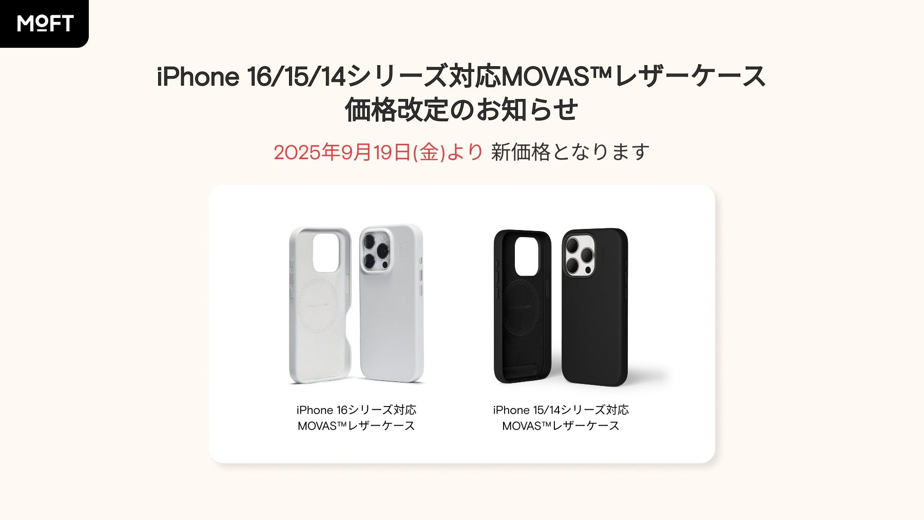 シンプルかつクリエイティブなPC・スマホ・タブレットアクサセリーを手がけるブランドMOFT(本社:米国カリフォルニア、代表取締役:Julianna He)が販売するiPhone 16/15/14シリーズ対応MOVAS™レザーケースは2025年9月19日(金)より、現行販売価格6,980円の価格を改定し、6,280円でご提供します。