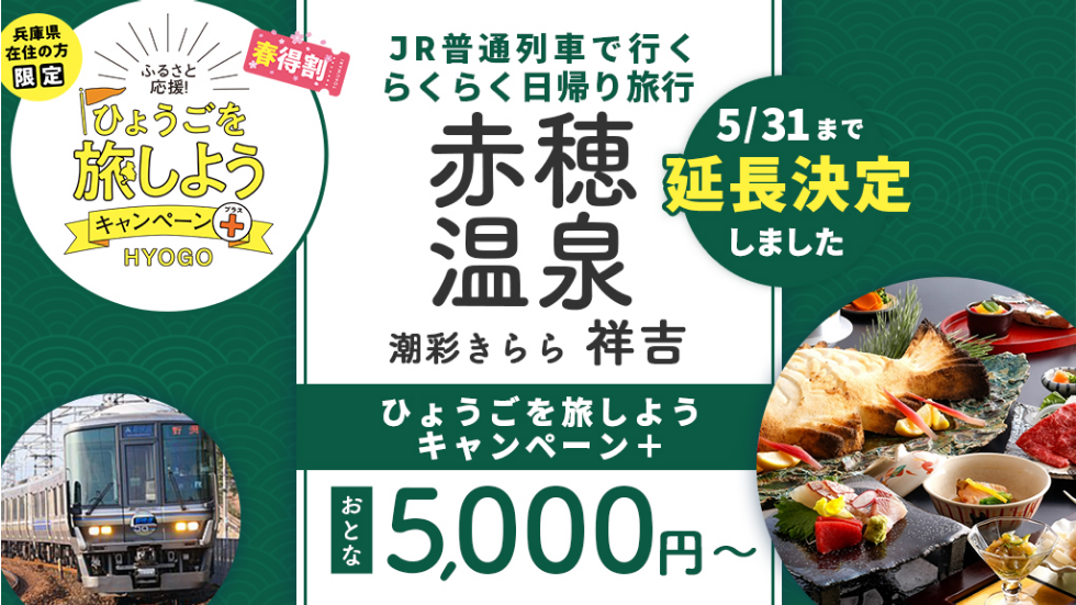 株式会社フォーティーズ(本社:大阪市鶴見区、代表取締役 岡武史)は5月31日迄延長になった「ふるさと応援!ひょうごを旅しようキャンペーン」の対象商品として「赤穂温泉 潮彩きらら祥吉」」のお食事と入浴往復JRがセットになったパックツアーのオンライン販売を開始しました。
