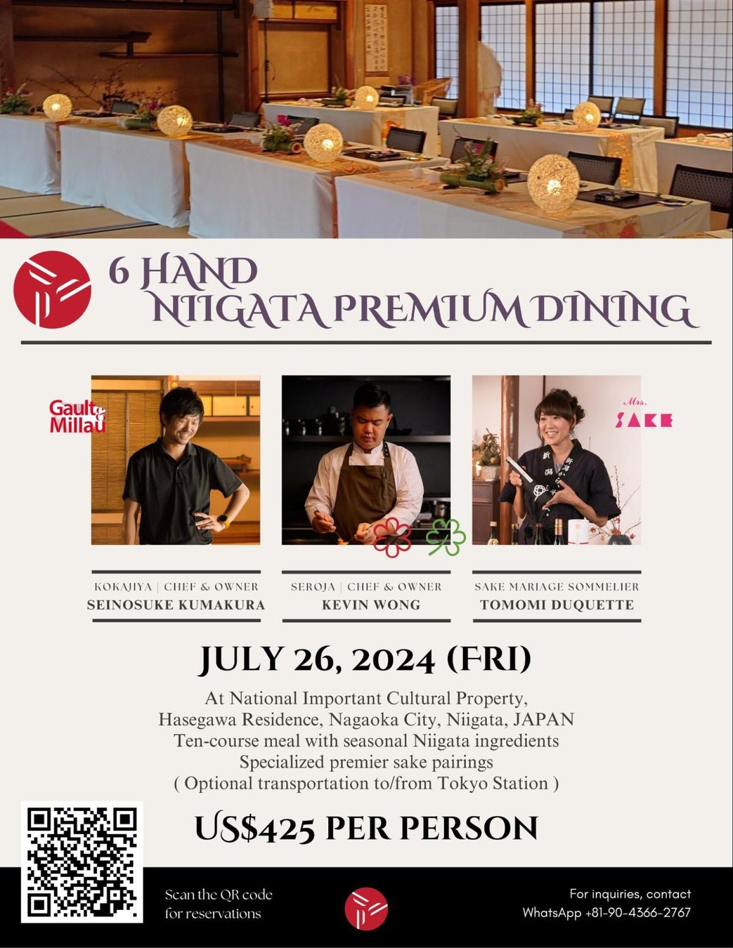 「6-Hand Niigata Premium Dining」では、世界的なシェフたちと共に、日本酒のマリアージュを通じて新潟の魅力を世界中のお客様にお届けするため、食材や日本酒はもちろん、文化財での貸切ローケーション、燕三条のカトラリー、グラスやお皿など、すべてを最高峰のものをご準備し、これまでにない体験とおもてなしをご用意いたします。私たちは、地方ならではの美味しさを通じて、東京や京都のような大都市ではなく、新潟のガストロノミーの魅力を世界に発信したいと考えています。そして今回のイベントが新潟という地方都市にとって新たな一歩となると確信しています。