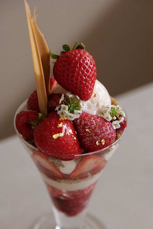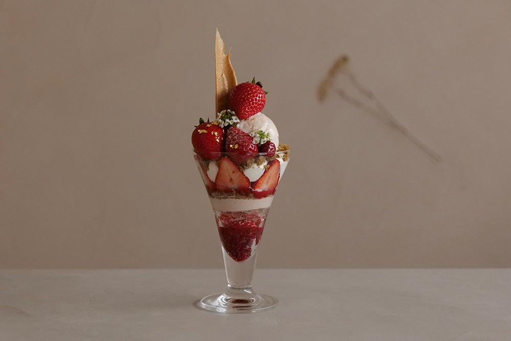 記念すべき初回のパルフェは秩父・和銅農園の苺"あまりん"のパルフェ。旬を迎えるあまりんの特徴を生かし、果実味がしっかりしているジューシーなあまりんはフレッシュとマリネにし、合わせるクリームにはマスカルポーネを加えてリッチなクリームに。優しいミルクチョコレートのムースや3種のベリーを使用したコンフィやジュレ、紅茶のクランブルで構成しました。