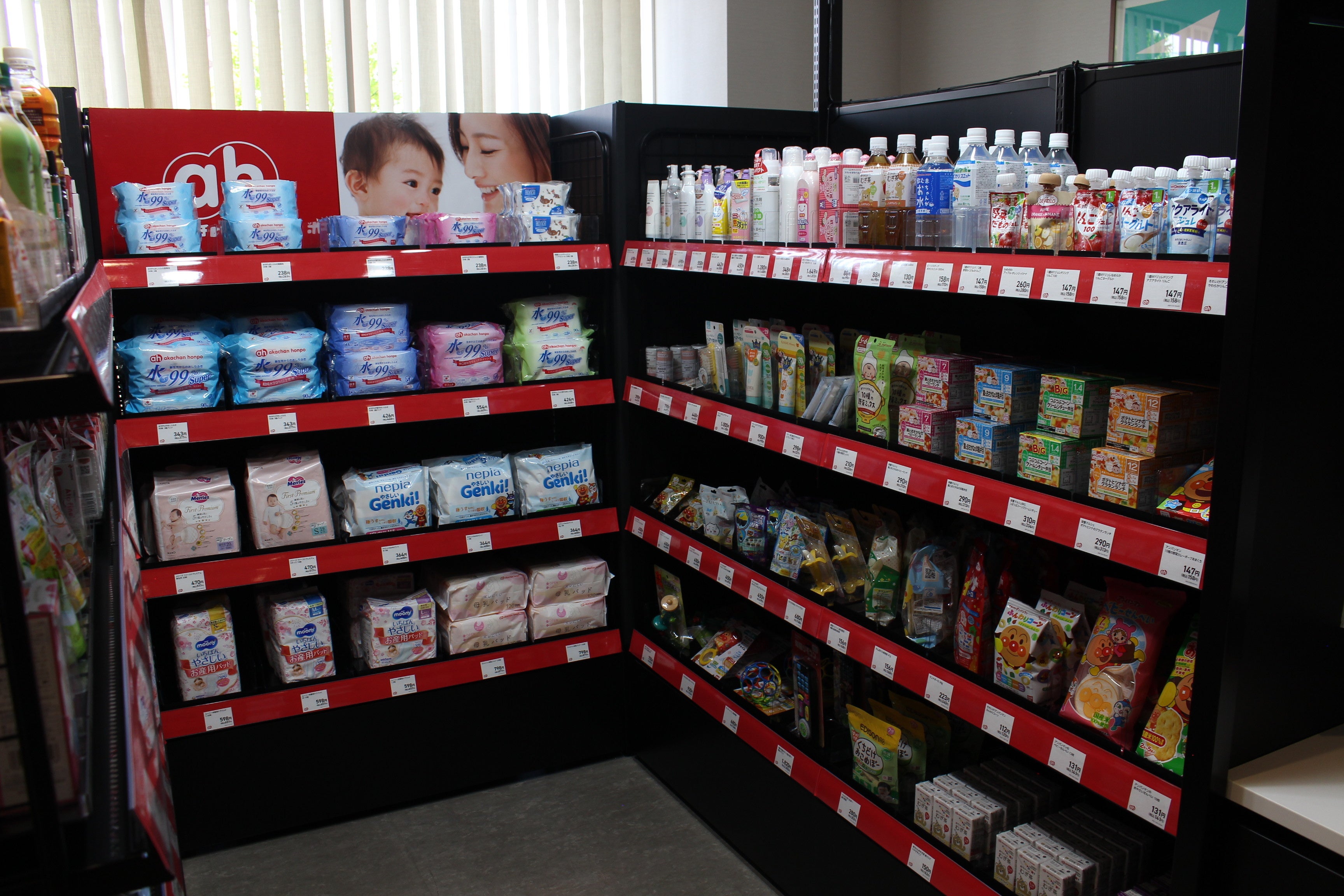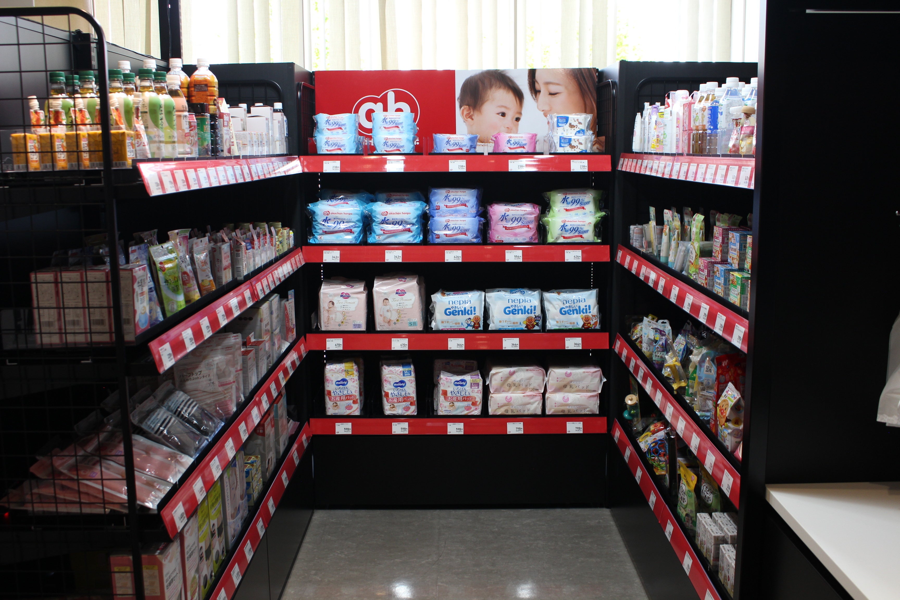 「アカチャンホンポ」の無人決済ショップは、大阪市の千船病院の1階に設置、産前産後に使用する商品や生まれた後すぐに使うおしりふき、ミルクなどの緊急性が高い商品に加え、ベビーフードやベビー飲料などをラインナップしました。