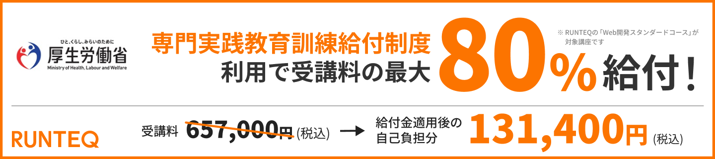 RUNTEQの『Web開発スタンダードコース』は、専門実践教育訓練給付制度の対象講座に認定されています。給付条件を満たすことで、受講料の最大80%(最大給付額525,600円)が給付金として支給されます。