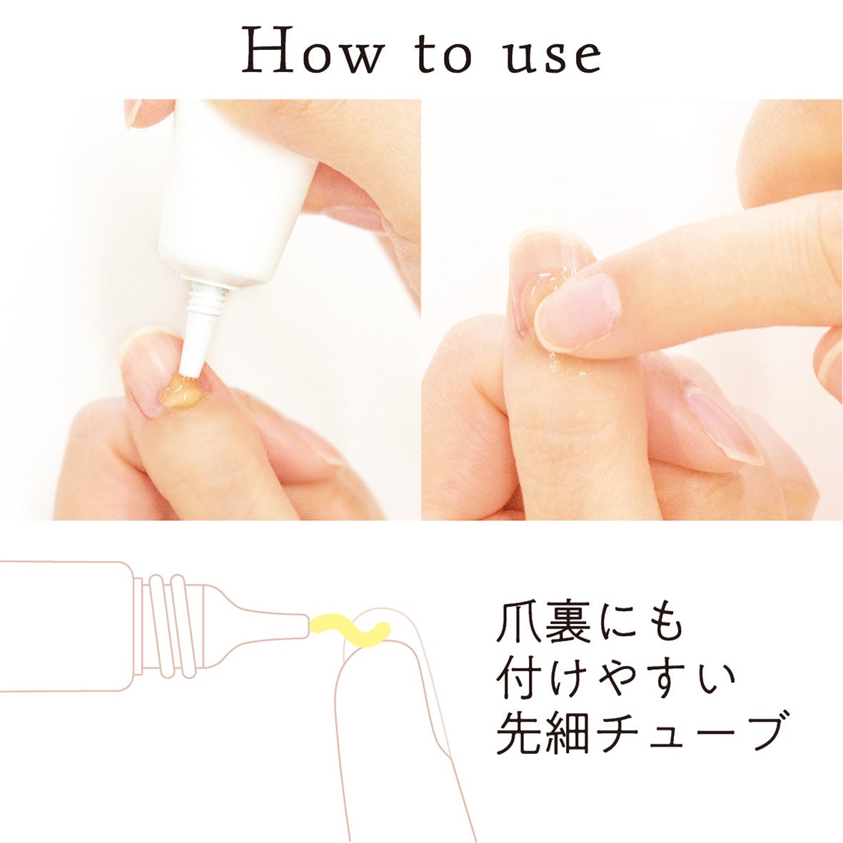 先細チューブで乾燥が気になる部分にピンポイントに塗り込むことができ、爪の表面だけでなく爪の根元や際、すらっと美しいピンク爪を目指す上でとても重要なパーツ「ハイポニキウム(爪を裏から支える甘皮部分、別名:爪下皮)」の集中保湿にもご使用いただけます。