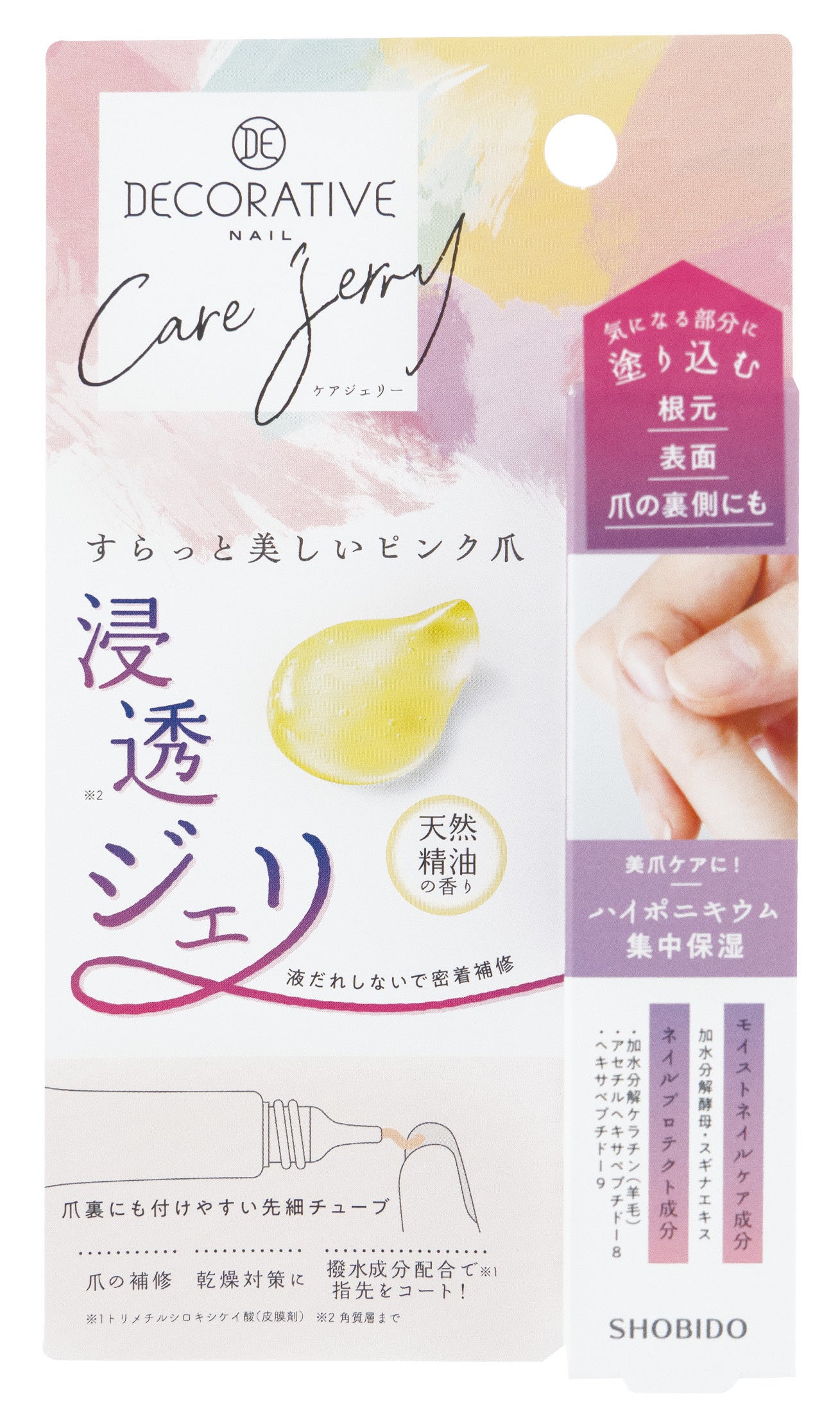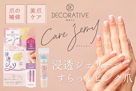 新商品「デコラティブネイル ケアジェリー」は、モイストネイルケア成分(※1)、ネイルプロテクト成分(※2)を贅沢に配合した、オイルだけど液だれしない新感覚のジェルタイプのネイルケアアイテムです。