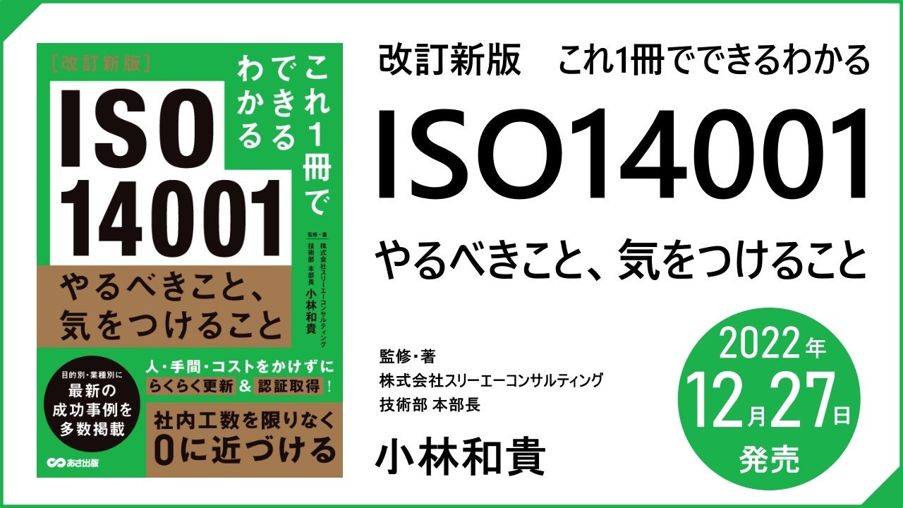 ISO・Pマーク支援実績数全国No.1※のISO/Pマークの取得・運用支援サービス「認証パートナー」を提供する株式会社スリーエーコンサルティング(本社:大阪府大阪市、代表取締役社長:竹嶋 寛人)は、『改訂新版 これ1冊でできるわかる ISO14001 やるべきこと、気をつけること』(監修・著:小林和貴)を2022年12月27日にあさ出版より発売いたしました。環境マネジメントシステムについて初めて学ぶ人へ、規格の目的や取得する意義、ISO14001で要求されている事項や重要用語について身に付けられるよう、図を多く使ってわかりやすく解説。本書を通して企業の円滑な環境マネジメントシステムの運用と経営活動への貢献を目指します。
