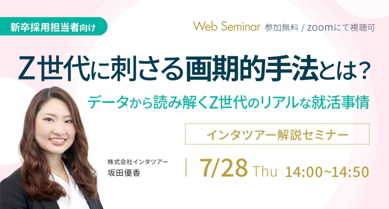 新卒採用マーケティング・プラットフォームを提供する(株)インタツアー(代表:作馬 誠大、本社:東京都港区浜松町)は、2022年7月28日(木)に、新卒採用担当者向けオンラインセミナー『Z世代に刺さる画期的手法とは?~データから読み解くZ世代のリアルな就活事情~』を開催いたします。