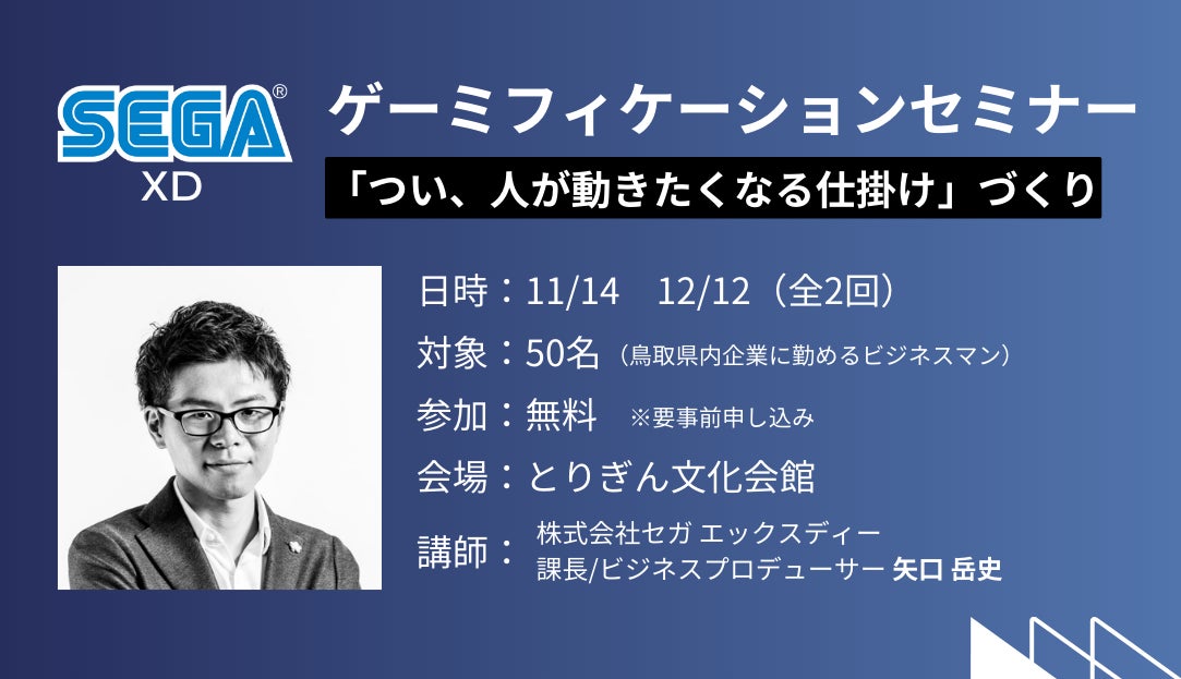 鳥取県産業未来創造課が主催する県内企業向けセミナープログラムにてセガ エックスディーが企画/講師をする「ゲーミフィケーションセミナー」を11月14日 (火)、 12月12日(火)の全二回で開催