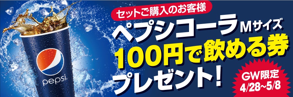 セットをご注文のお客様を対象に、ペプシコーラMサイズを通常価格270円のところ半額以下の100円でお楽しみいただける 『100円で飲める券』 をプレゼントいたします。チケットは6月30日(木)までご利用可能なので、ぜひこの機会にたくさん集めて、ウェンディーズ・ファーストキッチンでお得にお食事を楽しんでいただければと思います。
