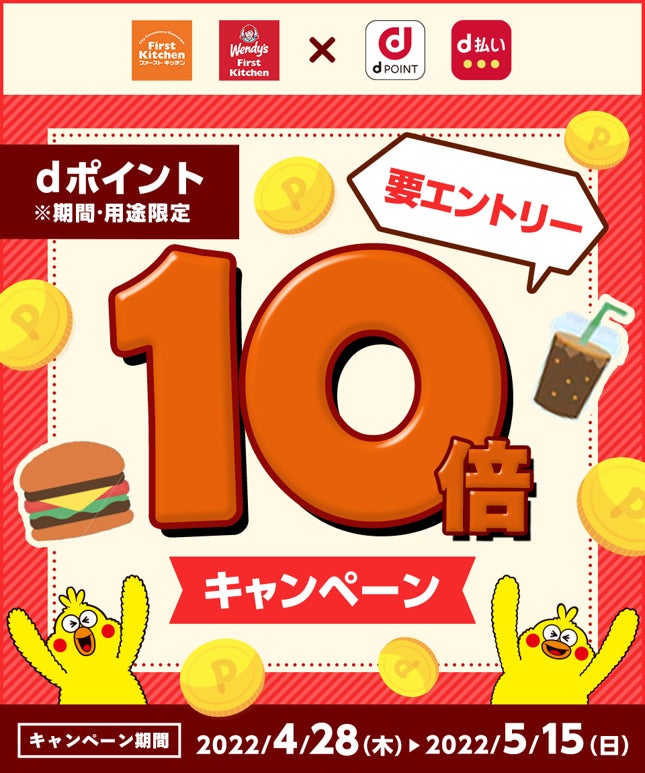 キャンペーンサイトからエントリーのうえ、ウェンディーズ・ファーストキッチン及びファーストキッチンの対象店舗で、お会計時にdポイントカード🄬/モバイルdポイントカード🄬/dカードGOLD🄬/dカード🄬/dカードプリペイド🄬をご提示いただくと、ポイントが10倍たまります!ぜひこの機会に、家族みんなでお得 にお食事を楽しんでいただければと思います。