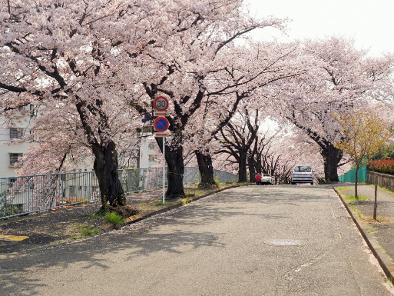 満開を迎えた施設前の桜並木は、この季節限定の「桜のトンネル」となり親しまれています。傾斜のある坂道になっていることから坂の上から見るとより美しさが際立ちます。