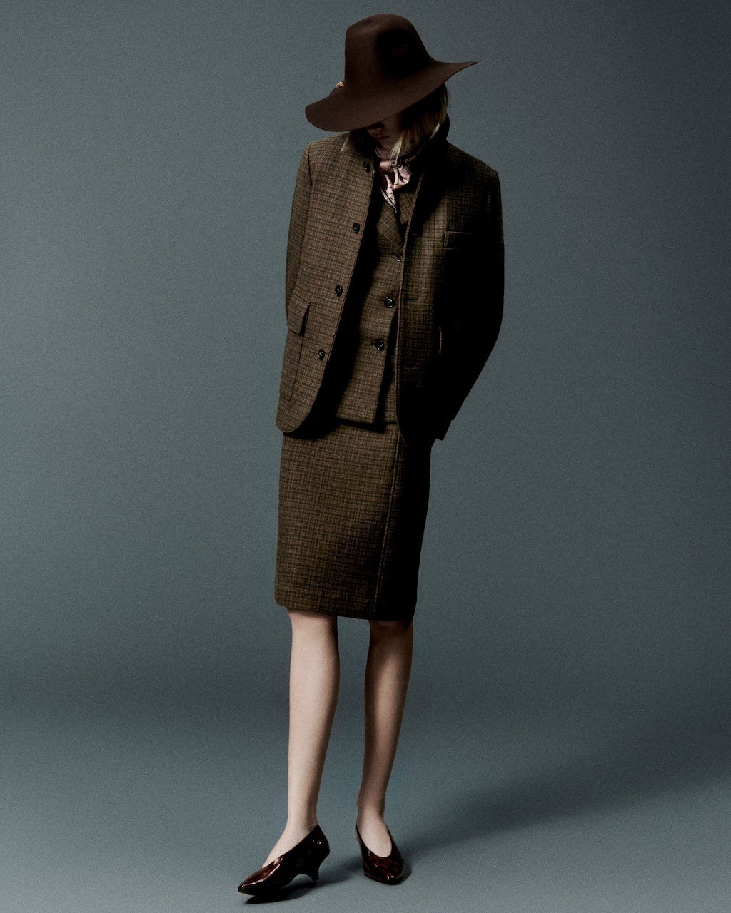 イブニングには、ロロ・ピアーナの真骨頂である、マスキュリンとフェミニンの永遠の競演における合理性とリラックス感が備わっています。細長いシルエットは、マニッシュなタキシード、バンドカラーのジャケット、ラペルに刺繍が施されたブレザー、そしてロングまたは膝丈のスカート、細身のパンツ、ジャカードシャツ、全体にスパンコールを施したシルクジョーゼットのドレスで構成されています。帽子はピルボックス型やすっきりとした形、あるいはつばの柔らかいタイプで、メッセージ全体にアクセントを添えています。