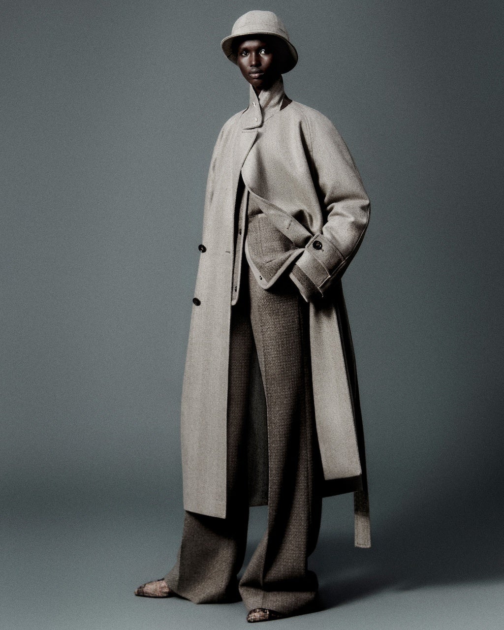 カシミヤ、ベビーカシミヤ、キャッシュツイード、シルク、シルクとキャッシュデニム®が、ソフトバター、ヌガー、ナチュラルライト・キャメル、 ダスティ・カーキといったクリーミーな色調をまとい、色彩と素材が豊かな質感と色の融合へと溶け合います。濃密な色合いのツンドラ(ロロ・ピアーナのニュートラルカラー)、モッシーブラウン、タウニーダーク・メランジュ、ディープバーガンディ、エクリプスブルー、そしてナチュラルダーク・ビキューナのタッチに、フランネルやメランジュグレー、ランゲグリーンの淡いアクセントが加わります。イブニングには、シルクサテン、ジャカードシルク、カシミヤが、黒または白のクラシックな色調のみで表現されます。