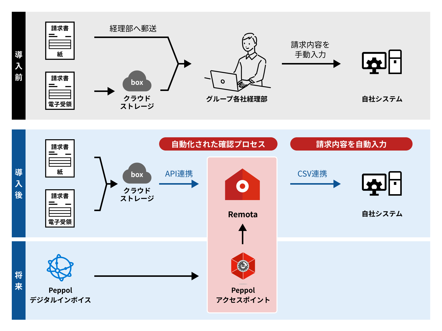 導入前は、紙で受領した証憑はグループ各社の経理部へ郵送したものを手動で自社システムに入力した後、原本と併せて承認へ回していました。また、電子受領したものはクラウドに保存後アドレス付与をして管理するといったプロセスを取っており、ペーパレス化やリモートワークは難しいという状況でした。