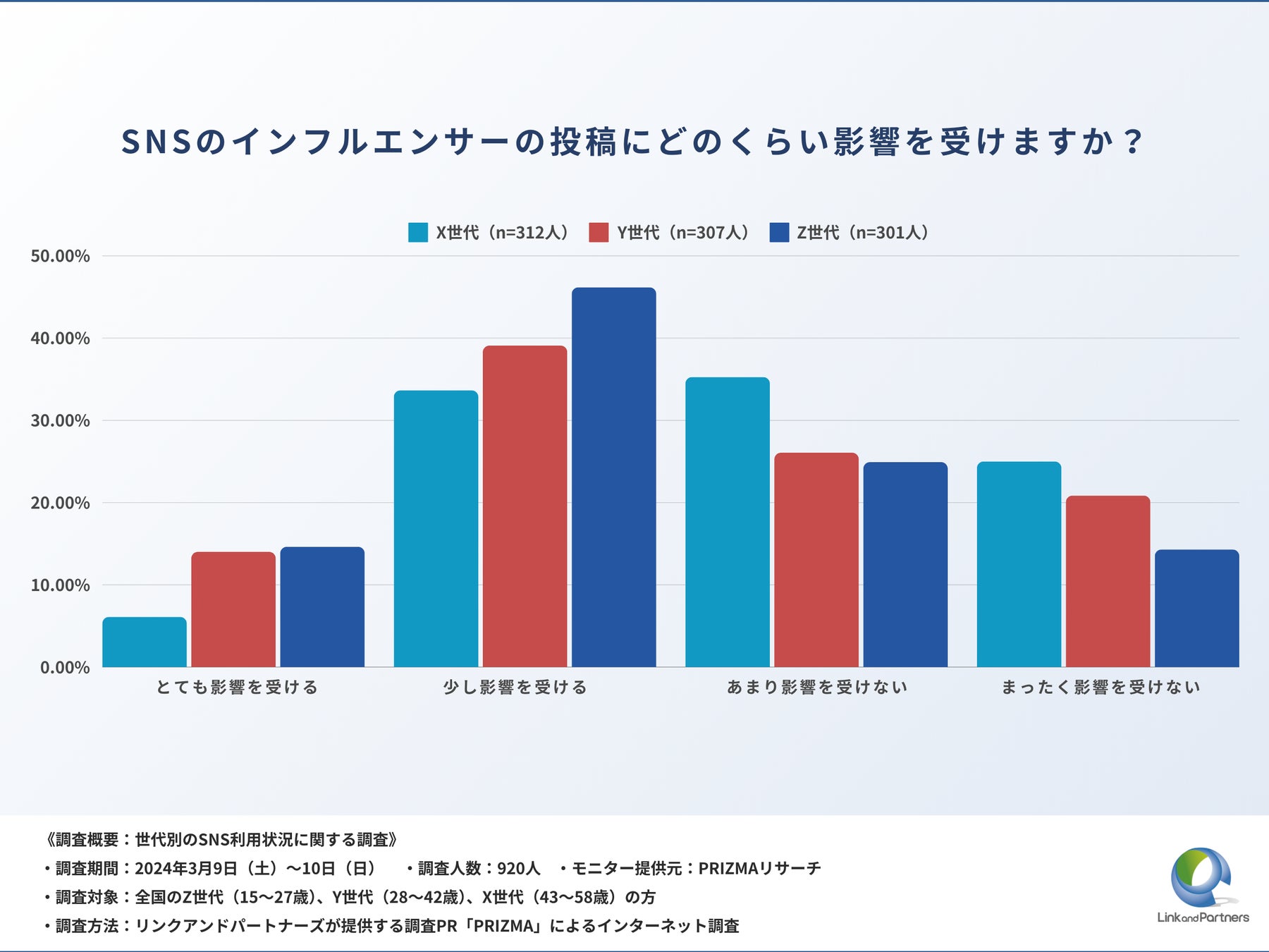 Y世代では、「少し影響を受ける」が39.1%で全体の平均と同様ですが、「とても影響を受ける」(14.0%)の割合が全体平均を上回り、インフルエンサーの投稿により影響を受けやすい傾向にあることがうかがえます。