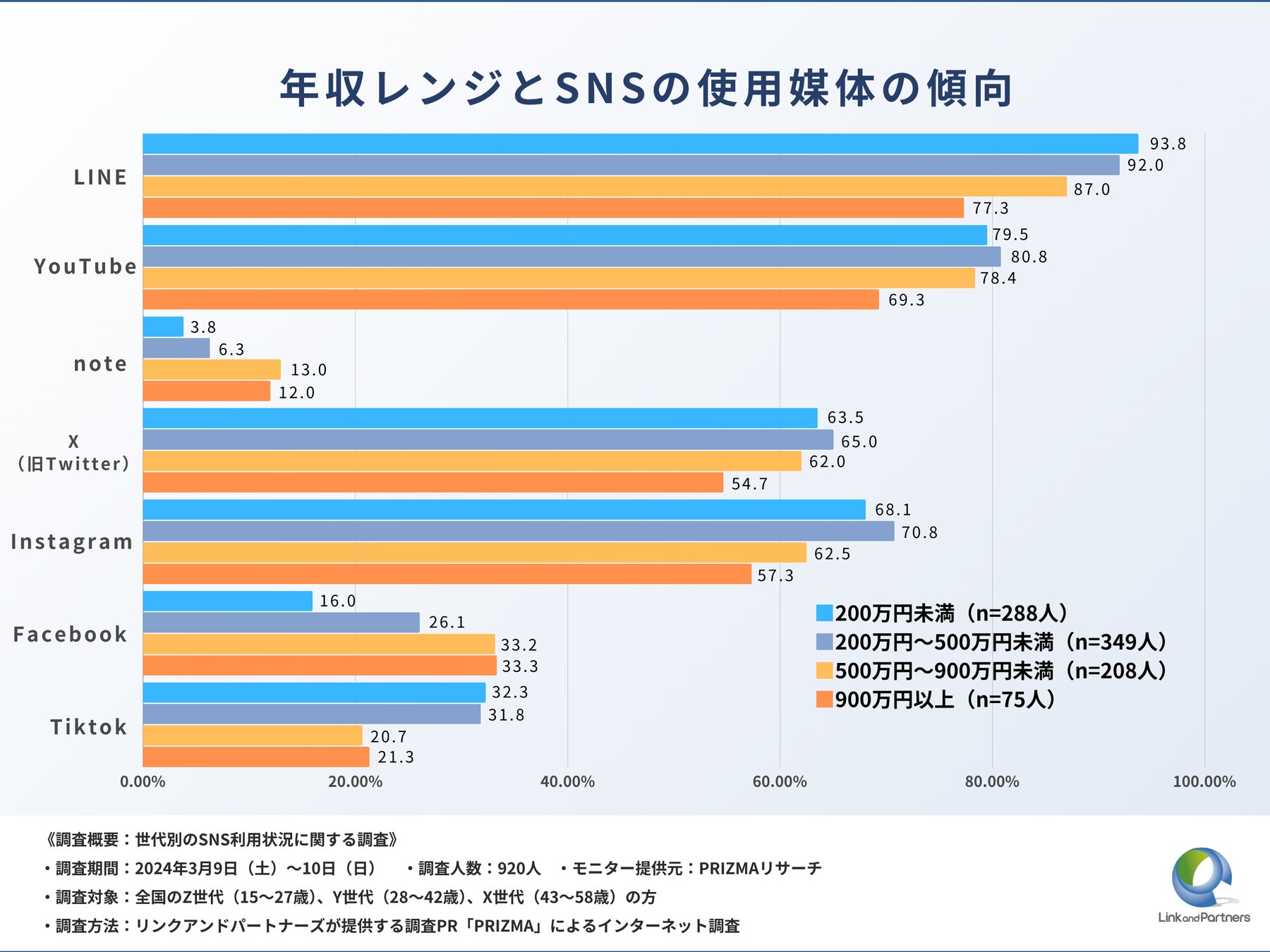 一方、TikTokは平均利用率が26.5%と比較的低く、特に高年収層では利用率がさらに低くなる傾向があります。Facebookは、「900万円以上」の年収レンジで最多の33.3%を占める結果になりました。noteは全体的に低い使用率(平均8.8%)を示していますが、年収が高い層ほど使用率が上がっていることが判明しました。