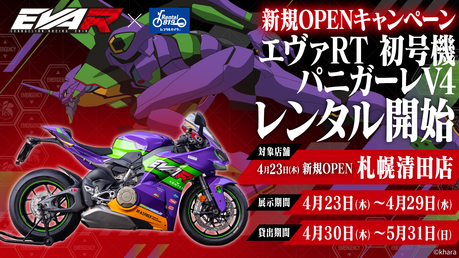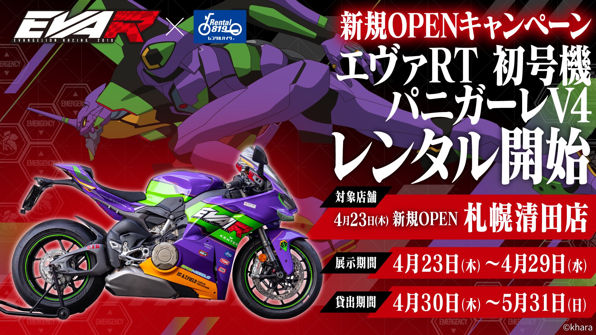 また、札幌清田店のオープンを記念し、エヴァンゲリオンレーシングとのコラボレーション企画として展開している特別仕様車両「エヴァRT 初号機 パニガーレV4」を期間限定で展開いたします。レンタル819ならではの、“見るだけで終わらない、実際に乗れる特別な体験”を北海道でも提供してまいります。