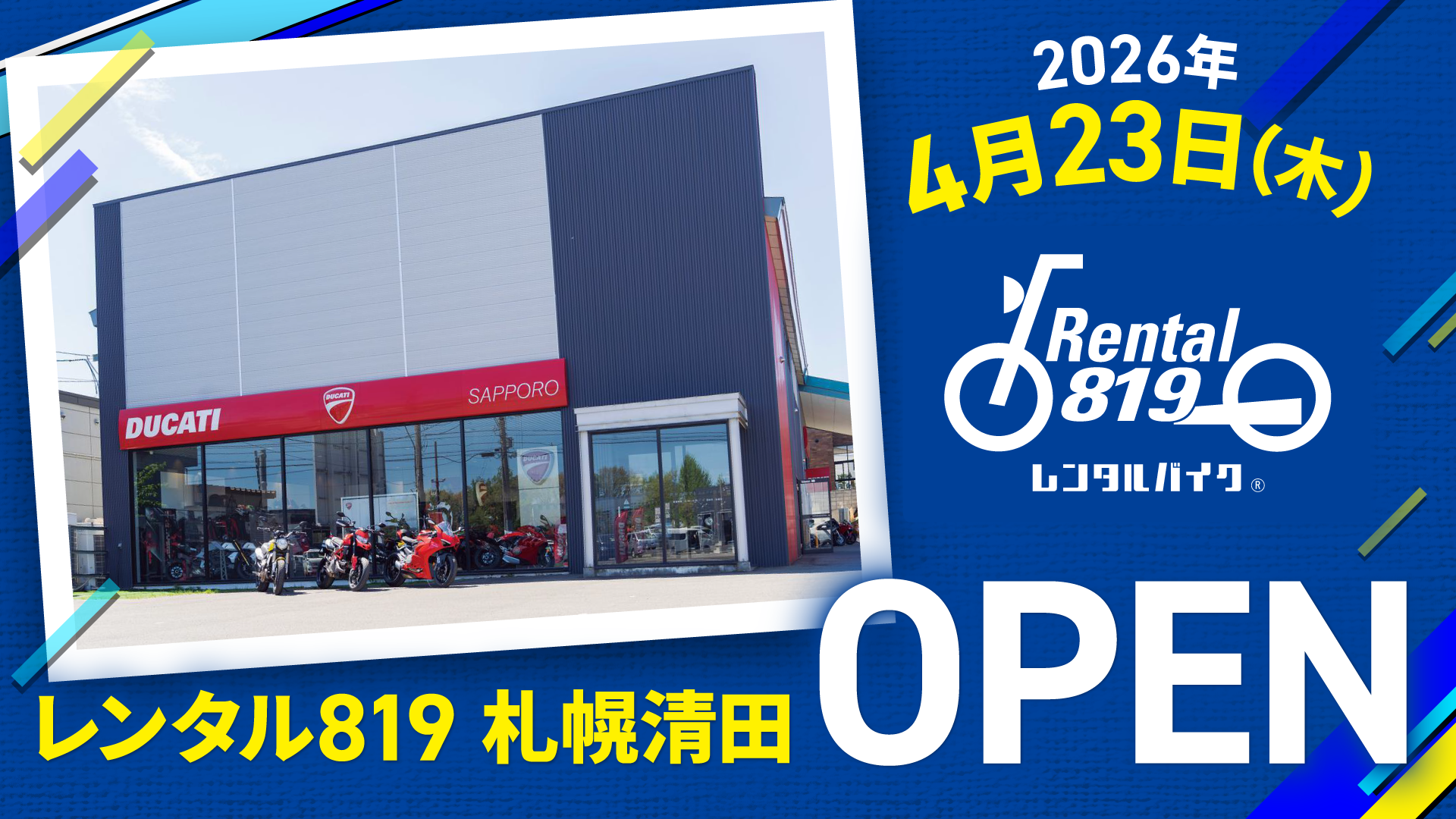 株式会社キズキレンタルサービスは、2026年4月23日(木)、北海道札幌市清田区に「レンタル819札幌清田」をオープンいたします。新店舗では、Ducatiを中心とした高級感あるラインナップを展開し、レンタルならではの気軽さで憧れの輸入バイクを体験いただけます。