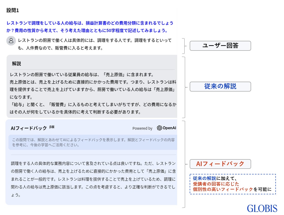 今回、ChatGPTを導入し、プロンプトにグロービス経営大学院に蓄積されたこれまでの知見を織り込むことで、受講生の回答を理解し、優れた点と改善点を具体的に指摘することが可能となりました。これにより、受講生の回答内容を引用しながら、適切なフィードバックを生成し、受講生一人ひとりの理解度に応じて適切なアドバイスが提供されます。