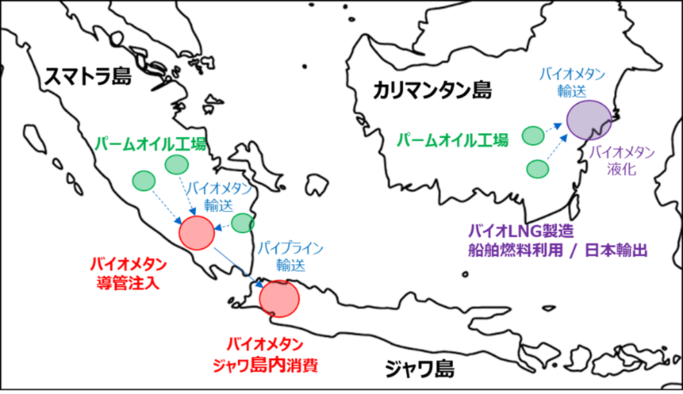 本事業では、インドネシアのスマトラ島およびカリマンタン島で製造したPOME由来のバイオメタンをジャワ島などのインドネシア国内需要家に供給することを想定し、その実現可能性を調査します。天然ガス導管などの既存インフラを利用したバイオメタンの供給および供給先での利用を通じて、インドネシアで増加する天然ガス需要に応えるとともに、化石燃料からバイオメタンへの燃料転換による需要家のスコープ1*2のCO2排出量を削減することを目標としています。また、現状大気放散されているメタンガスを有効活用することによるカーボンクレジットやバイオメタン認証などの制度活用も検討します。更には、バイオメタンを液化したバイオLNGを船舶燃料として供給する事業、バイオLNGを日本などに輸出する事業の検討を実施します。