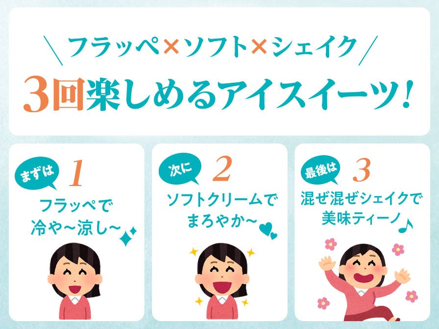 まずに最初はフラッペを。次に下のソフトクリームを食べてから最後に二つの層を混ぜて、シェイクにしてお召し上がりください。