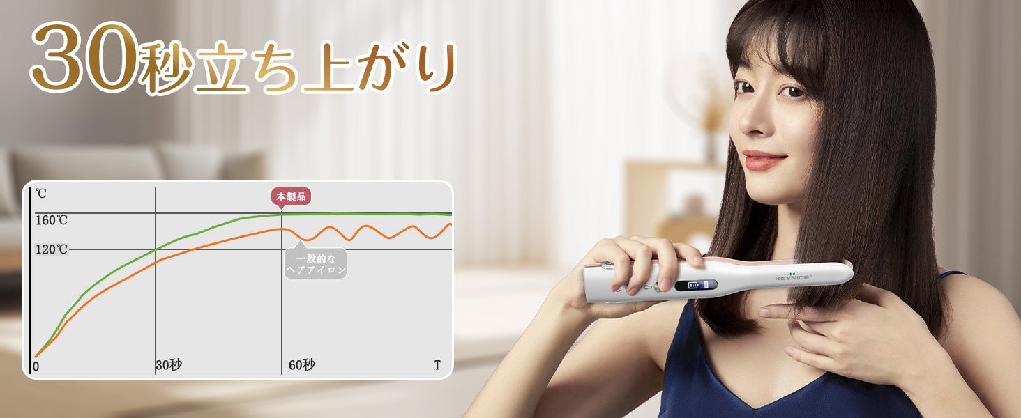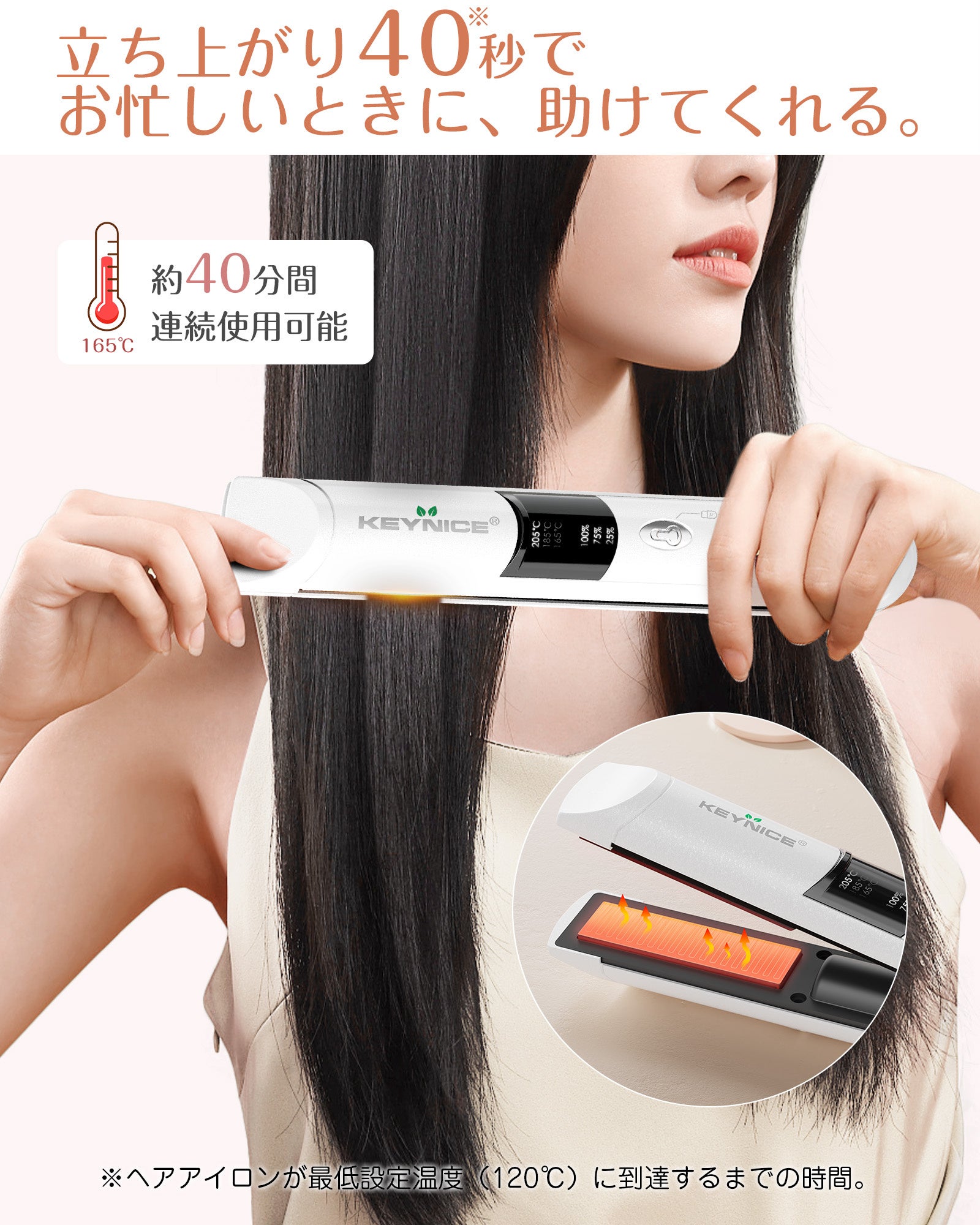 プレート表面には髪にやさしいセラミックコーティングを採用、速めに熱くなりだけでなく、熱伝導が良いです。約40秒で使用可能な温度(約120℃)に到達し、コードレスで通勤する前/車内/会社/旅行/出張など色々なシーンで活躍しています。