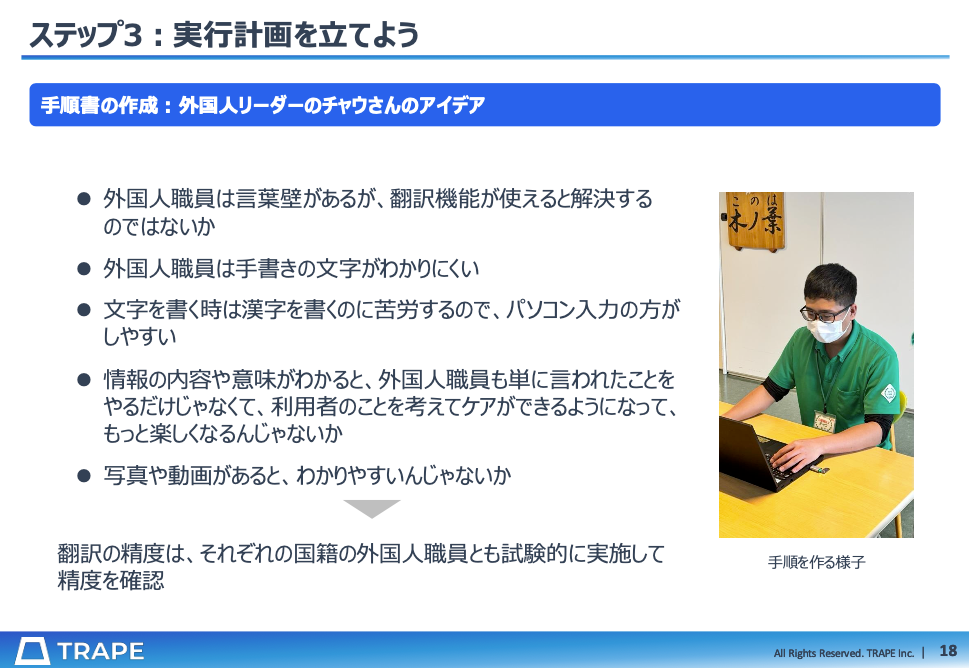 外国人職員がケアの意味を理解し、自信を持って業務に取り組めるようになった