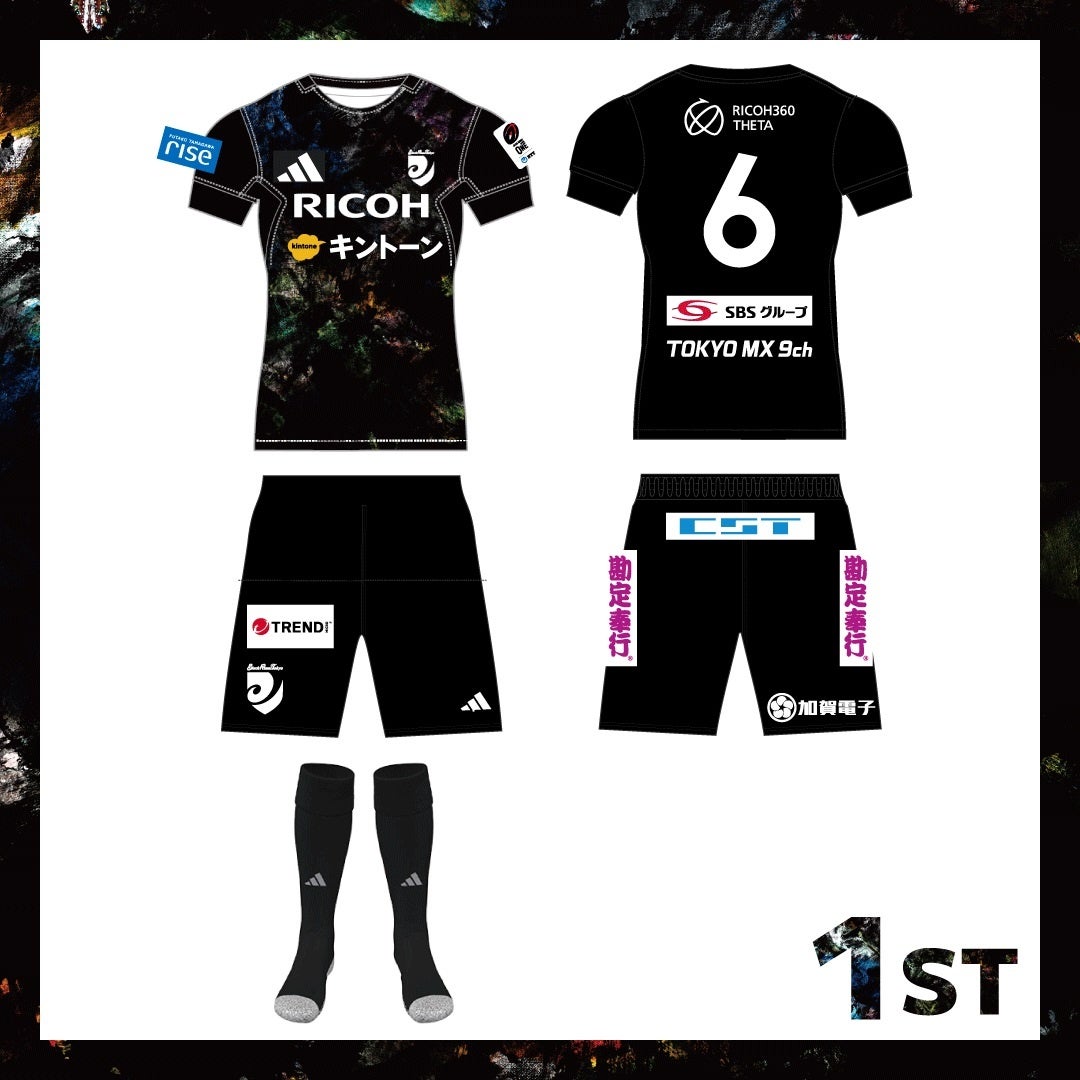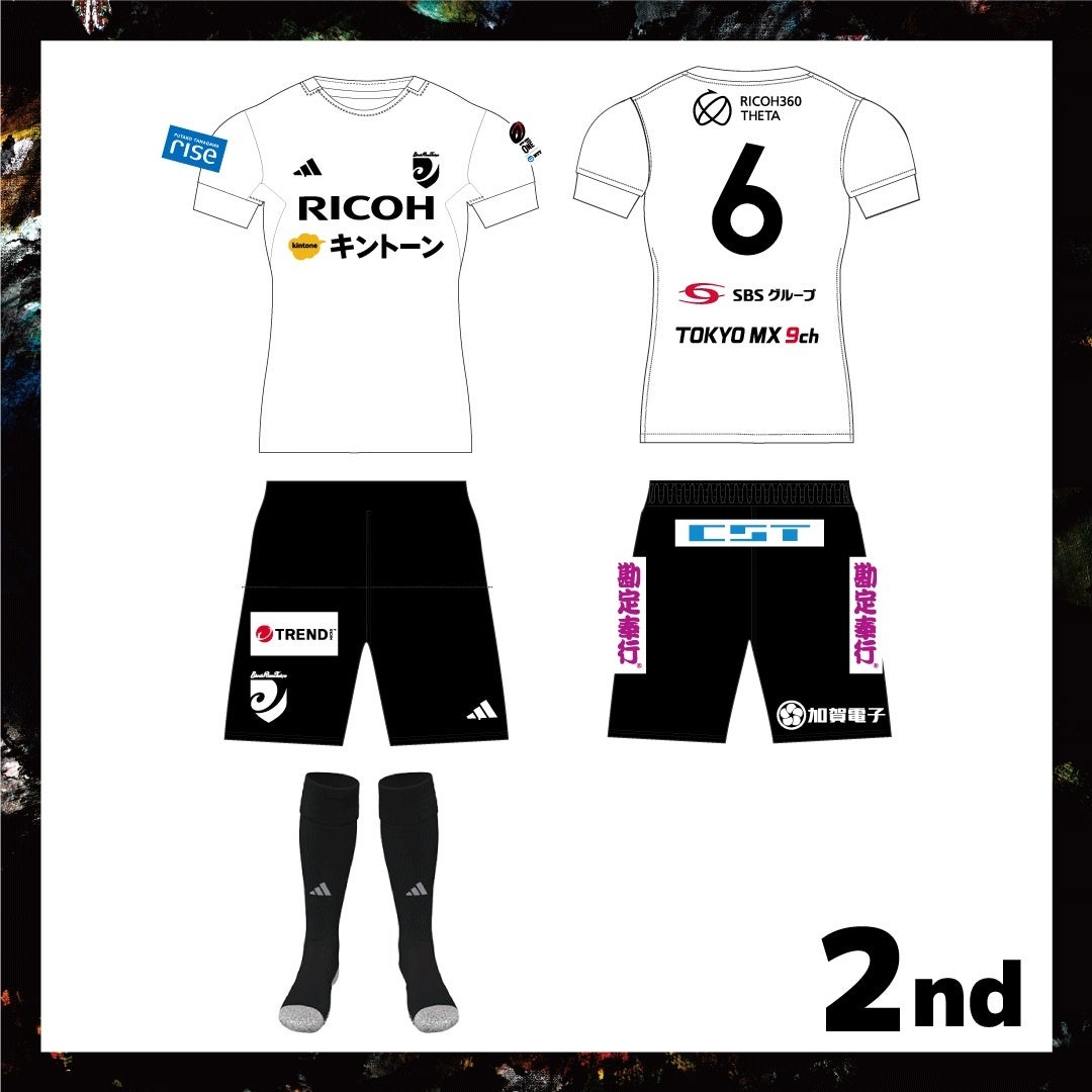 昨シーズンに引き続き、ジャージには二子玉川ライズ(右袖)・SBSグループ(背面下部)・TOKYO MX(背面下部)、パンツには株式会社コンピューターシステム研究所(腰部)・トレンドマイクロ株式会社(前面下部右側)・加賀電子株式会社(背面下部右側)・株式会社オービックビジネスコンサルタント(2024-25シーズンより両脇縫い線)の各パートナー企業のロゴが入ります。