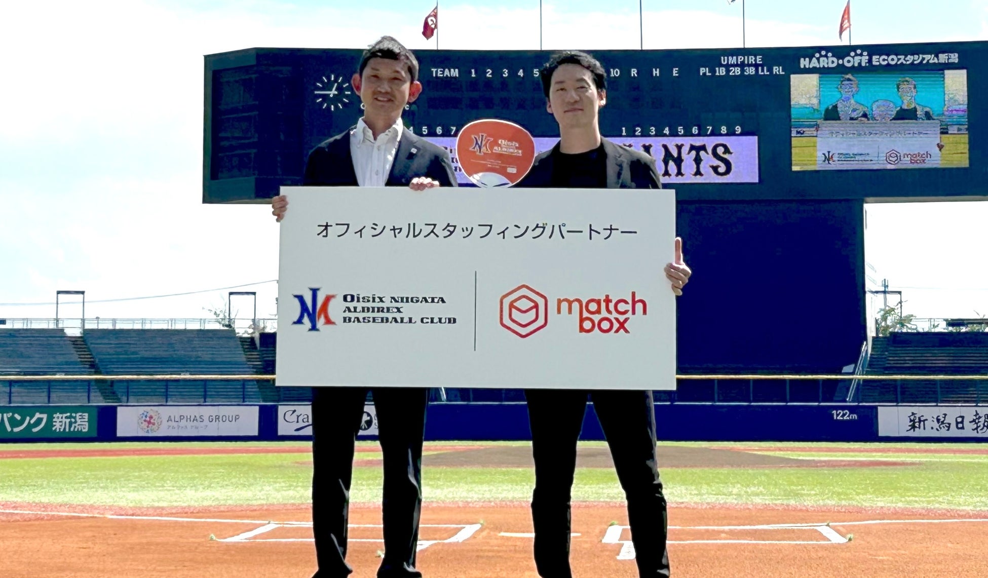 株式会社Matchbox Technologies(マッチボックステクノロジーズ 本社:新潟県新潟市中央区、代表取締役社⻑:佐藤 洋彰)は従業員・パートタイマー・アルバイト・スポットワーカーを含めた各社独⾃の⼈材プールを構築し、1日・数時間単位の求人と働き手をオンラインでマッチングするスポットワークプラットフォーム「matchbox(マッチボックス)」の構築・運用をサポートしています。マッチボックステクノロジーズは、今シーズンから日本野球機構(以下 NPB)ファーム・リーグに参加しているオイシックス新潟アルビレックス・ベースボール・クラブ(以下 アルビレックスBC)を運営する株式会社新潟アルビレックス・ベースボール・クラブ(本社:新潟県新潟市中央区、代表取締役社長:池田 拓史)と、2024年9月より、オフィシャルスポンサー(オフィシャルスタッフィングパートナー)契約を締結します。マッチボックステクノロジーズはオフィシャルスタッフィングパートナーとして、入場ゲート設置パネルや記念撮影用パネルなど各種パネル、球団公式ホームページなどにロゴを掲出します。オフィシャル「○○」パートナーとは、アルビレックスBCと各スポンサー企業との協業のスキームであり、マッチボックスはオフィシャル「スタッフィング」パートナーとしてアルビレックスBCのホームゲームの運営スタッフや販売スタッフの募集を行い、アルビレックスBCの球団運営をサポートして参ります。