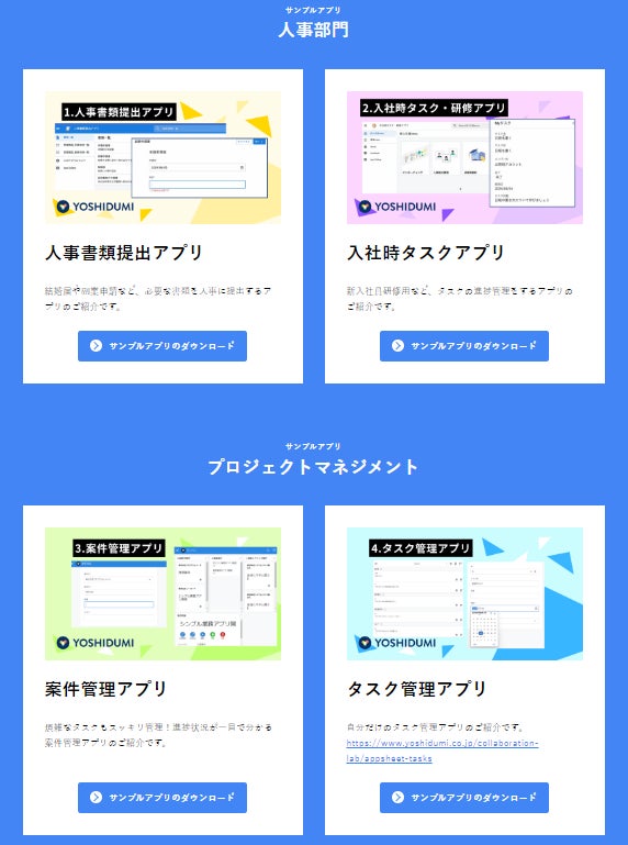 案件管理、人事書類提出など、様々な業務に対応するサンプルアプリを掲載しています。