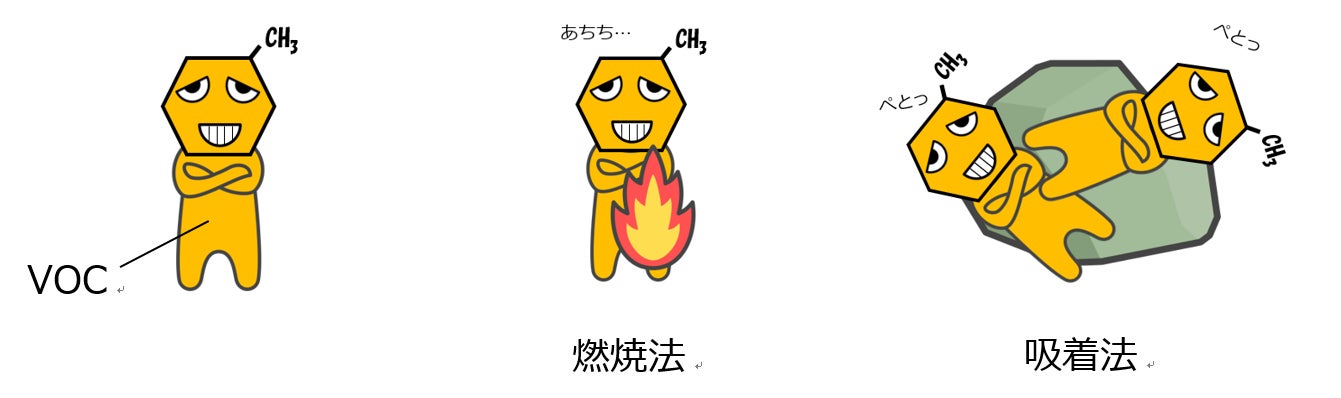 VOCの処理技術にはいくつかあり、主流なものとして燃焼法と吸着法があります。燃焼法はVOCを含んだガス中にバーナを設置し、加熱することで酸化させる方法です。
