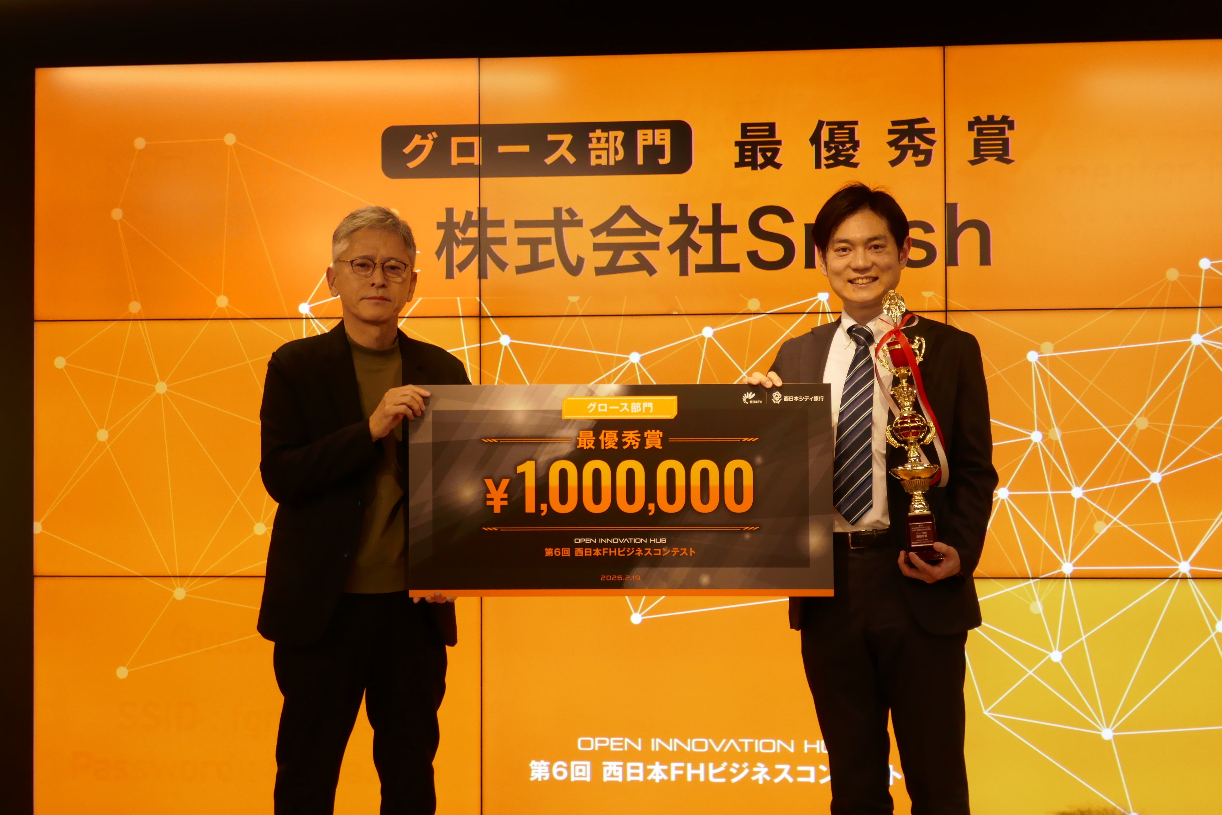 このたび当社は、2026年2月19日(木)に開催された「第6回西日本FHビジネスコンテスト」において、グロース部門の最優秀賞を受賞いたしました。本コンテストは、西日本FHグループおよび地場企業との協業を通じ、地域経済の活性化や地域課題の解決に資するビジネス創出を目的としたオープンイノベーション型の取り組みです。第6回となる今回は全国153組の応募があり、厳正な審査を経て、当社の取り組みに高い評価をいただきました。
