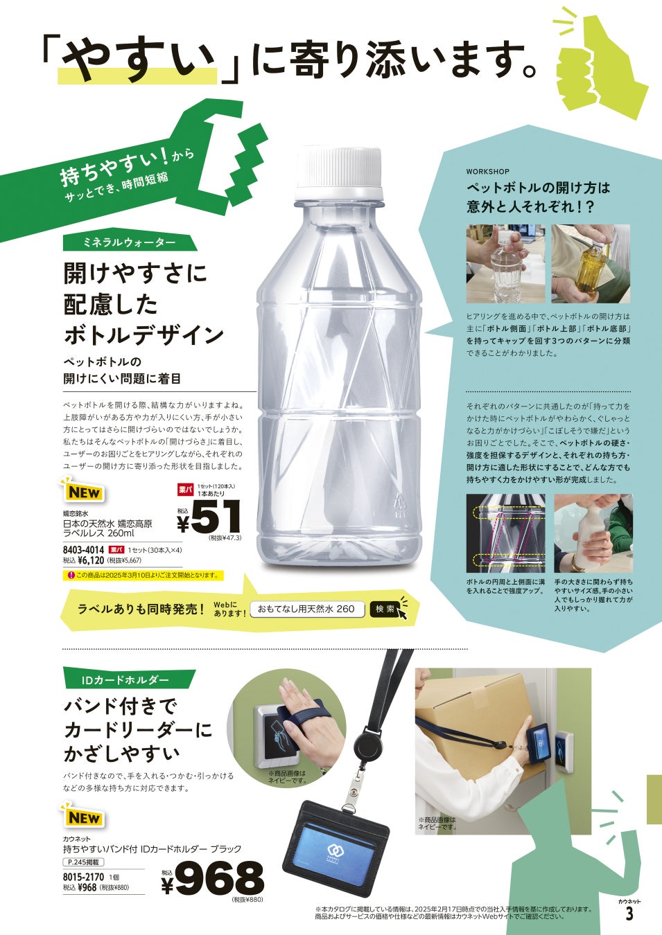 今号の巻頭特集では、「HOWS DESIGN」の取り組みにより、多様な人々のさまざまな「やすい」に寄り添い、「持ちやすい」「取り出しやすい」「視認しやすい」に配慮した商品を紹介しています。特に、2025年3月10日(月)に新発売となるミネラルウォーターは、多くのリードユーザーの多様な開け方を参考に、持ちやすく開けやすい形状のボトルを開発しており、今号の表紙も飾る一押しの商品です。これらの商品は、使いやすさを追求し、日常の利便性を高めることを目指しています。