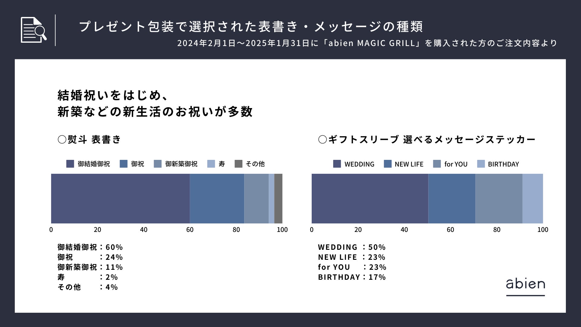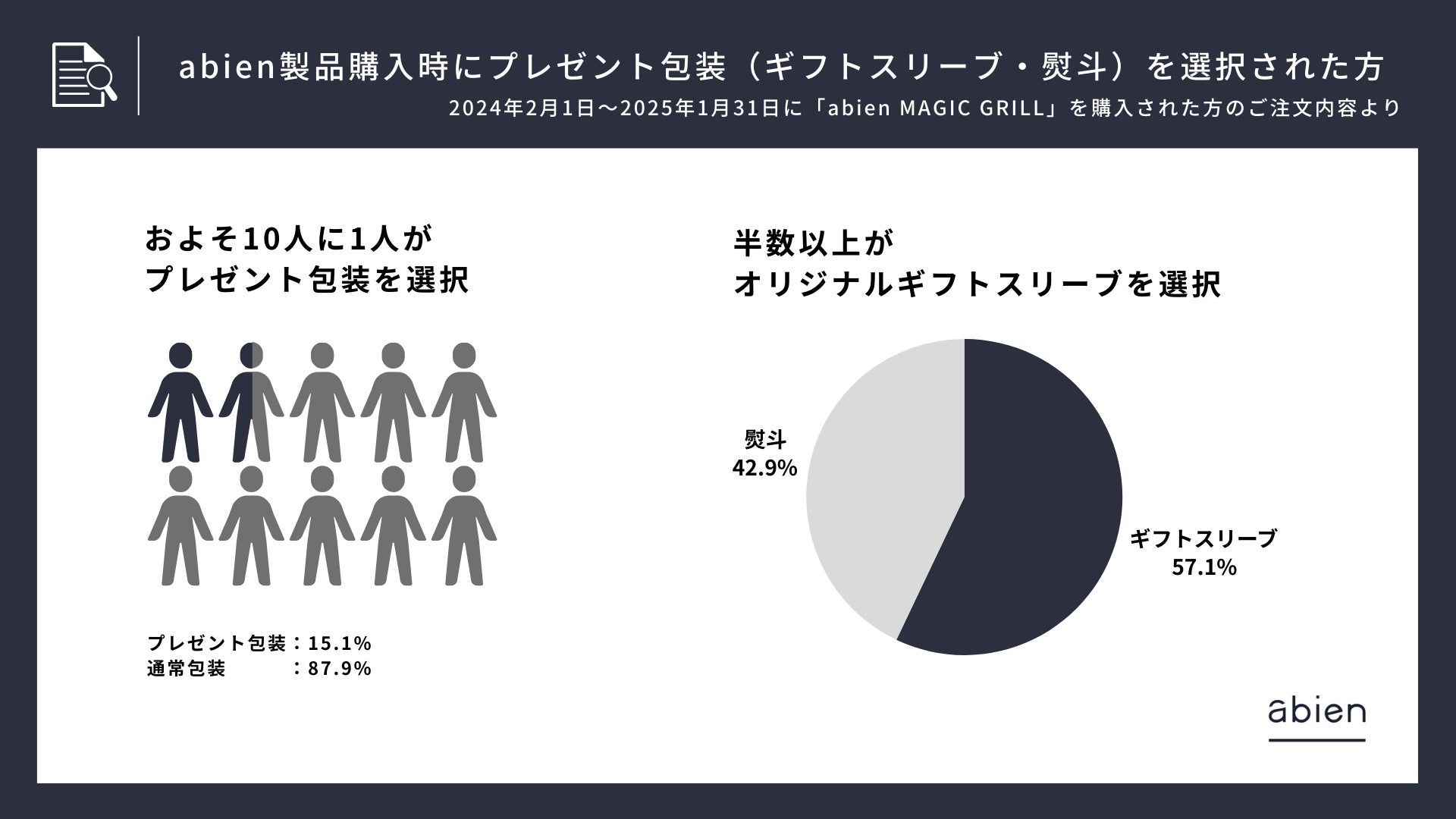 2024年2月1日〜2025年1月31日の「アビエン マジックグリル」の注文実績によると、注文全体の15.1%を占める割合でプレゼント包装(オリジナル熨斗、もしくはオリジナルギフトスリーブ)が注文されており、購入者の10人に1人以上がプレゼントとしての購入を選択されています。