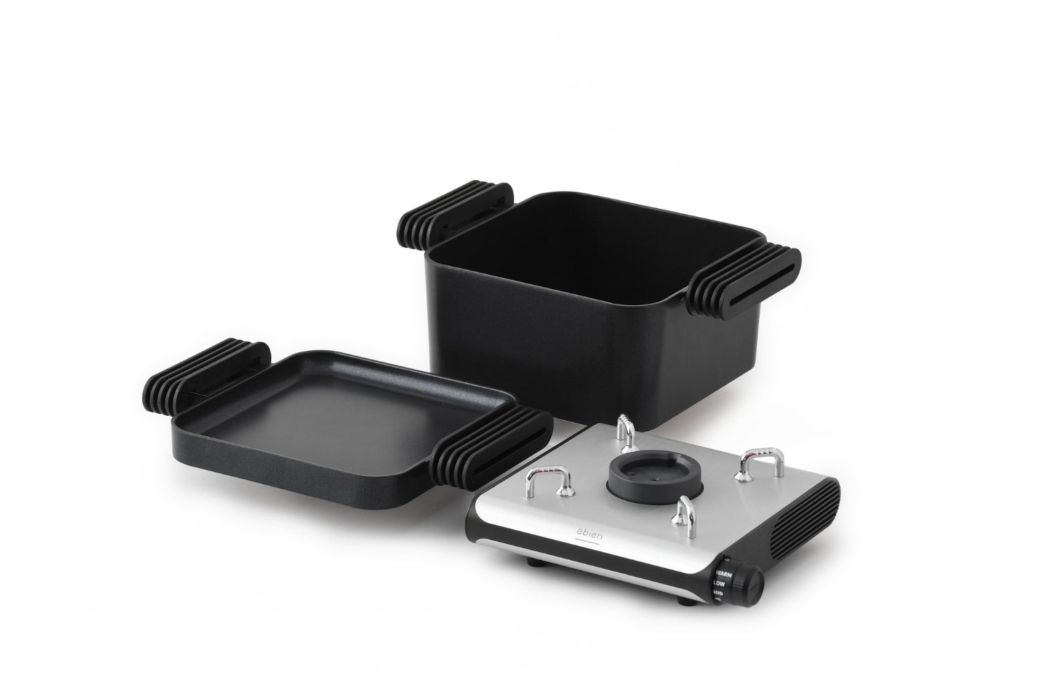 フラグシップモデルの「アビエン マジックグリル」はフチがないプレートであるため、日常の調理はもちろん、串焼きなどホームパーティメニューにもぴったり。約6cmの深鍋型の「アビエン マジックグリルM」は約3.1Lの大容量で4〜5人家族の食卓に、約25cm四方で約2cmのフチがついた「マジックグリルS」は1人から2人暮らしの方に特に適しています。