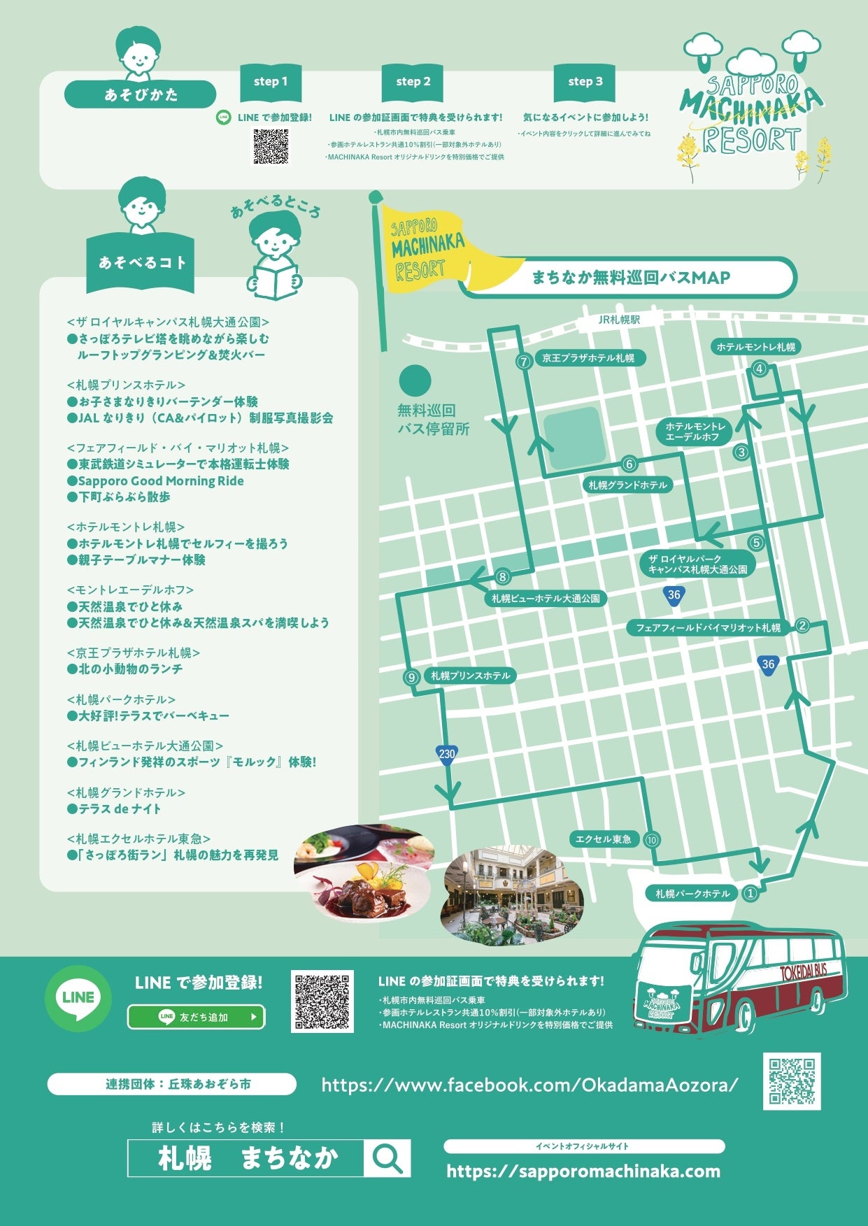 期間中は、ホテル間の移動に便利な「まちなか無料巡回バス」が毎日13時から21時までの間、30分毎に運行されています。また7月16日、8月6日、8月20日の計3日間は、新鮮な地元野菜や果物が並ぶファーマーズマーケット「丘珠あおぞら市」会場(直売所「ピリカ札幌」駐車場)まで無料巡回バスを別途運行する予定です。