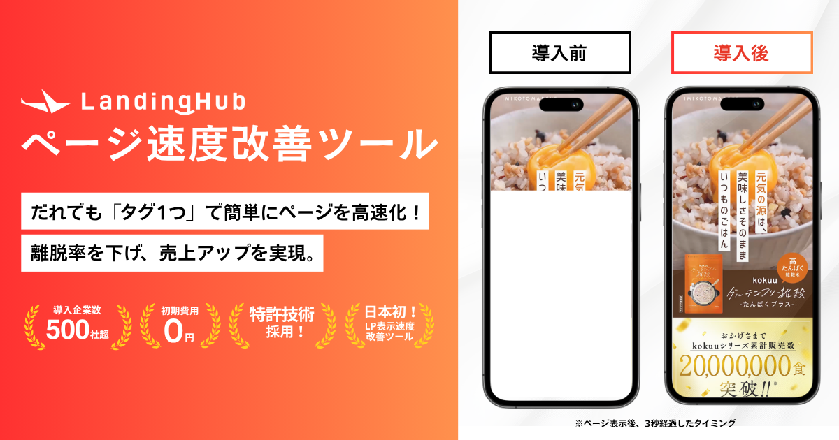 LandingHubはタグを1行追加するだけで、画像・動画を自動圧縮、次世代フォーマット(WebP/AVIF等)への自動変換、CDN最適化と負荷分散など、導入初日からページの読み込み速度を高速化し、直帰率の低下・CVR向上・SEO効果・サーバーコスト削減のサポートを同時に実現いたします。