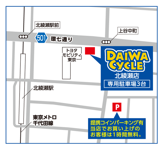 ダイワサイクル北綾瀬店は、環七通りに面したトヨタモビリティ東京横、東京メトロ北綾瀬駅3番出口から東に徒歩約2分に位置します。高層マンションや商業施設も多く、人通りの多い立地ながら大型の公園も多い、休日のサイクリングにも適した立地です。通勤通学途中やお買い物途中に空気入れや、お困りごとなど、気軽にぜひお立ち寄りください。