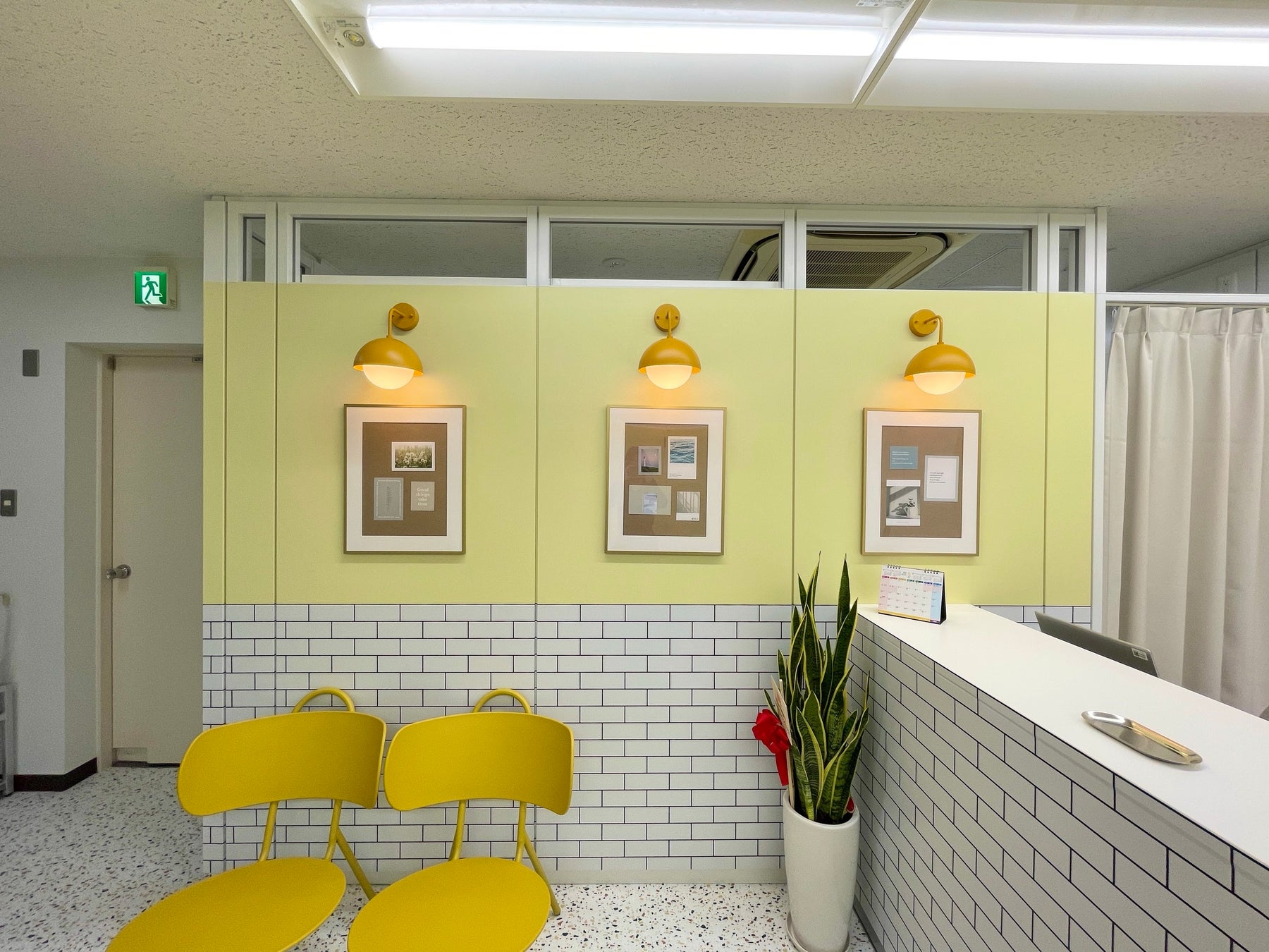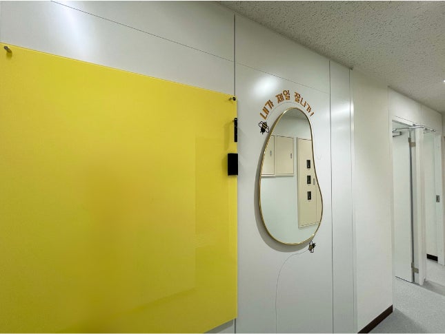 校舎のテーマは【ハチミツ】となっており、K Village韓国語では初のイエローで室内を統一しました。デザイナーが韓国のカフェに直接足を運び、韓国のカフェをイメージしてデザインしました。