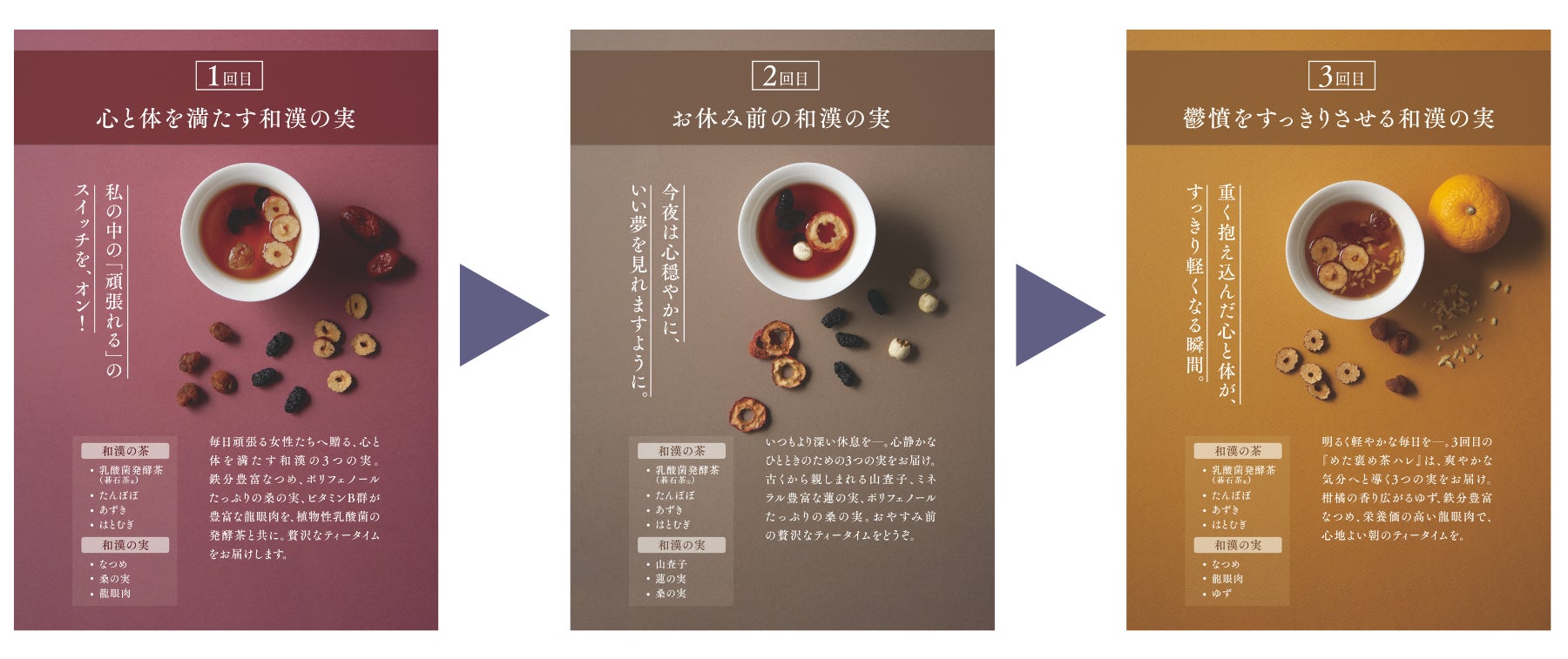 『めた褒め茶ハレ』は、伝統の乳酸菌発酵茶〝碁石茶®〞を主役に、たんぽぽ茶やあずき茶、はとむぎ茶といった女性に嬉しい〝和漢の茶〞を詰めたティーバッグと、なつめや龍眼肉、山査子、蓮の実、