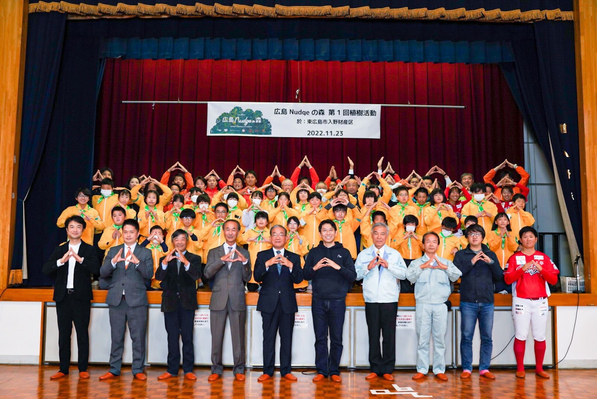 植樹を予定していた当日はあいにく雨天となり、植樹作業に代えて屋内での式典開催となりましたが、高垣東広島市長をはじめとする東広島市の皆様、協賛企業の代表者様、みどりの少年団の子供達や地元の青年会議所の皆様にもご参加いただき、多くの関係者の皆様と「広島Nudgeの森」プロジェクトの開始を祝うことができました。