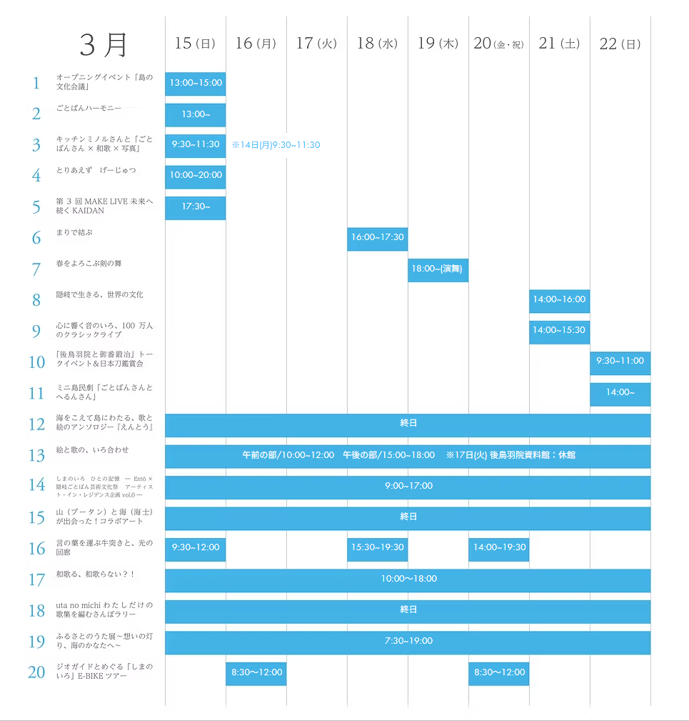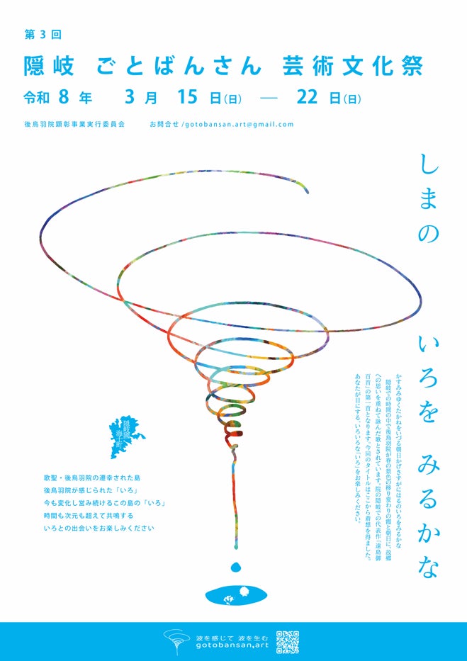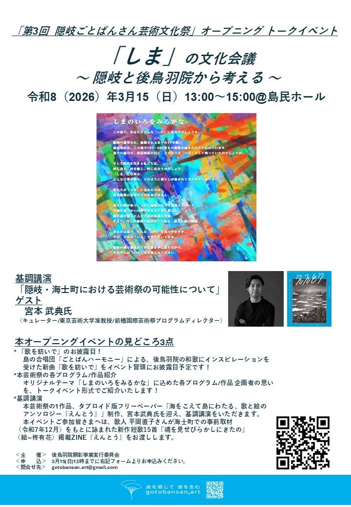 後鳥羽院顕彰事業実行委員会(委員長:大江和彦海士町長)では、令和8年3月15日(日)~22日(日)にわたり、「第3回 隠岐ごとばんさん芸術文化祭」を開催します。