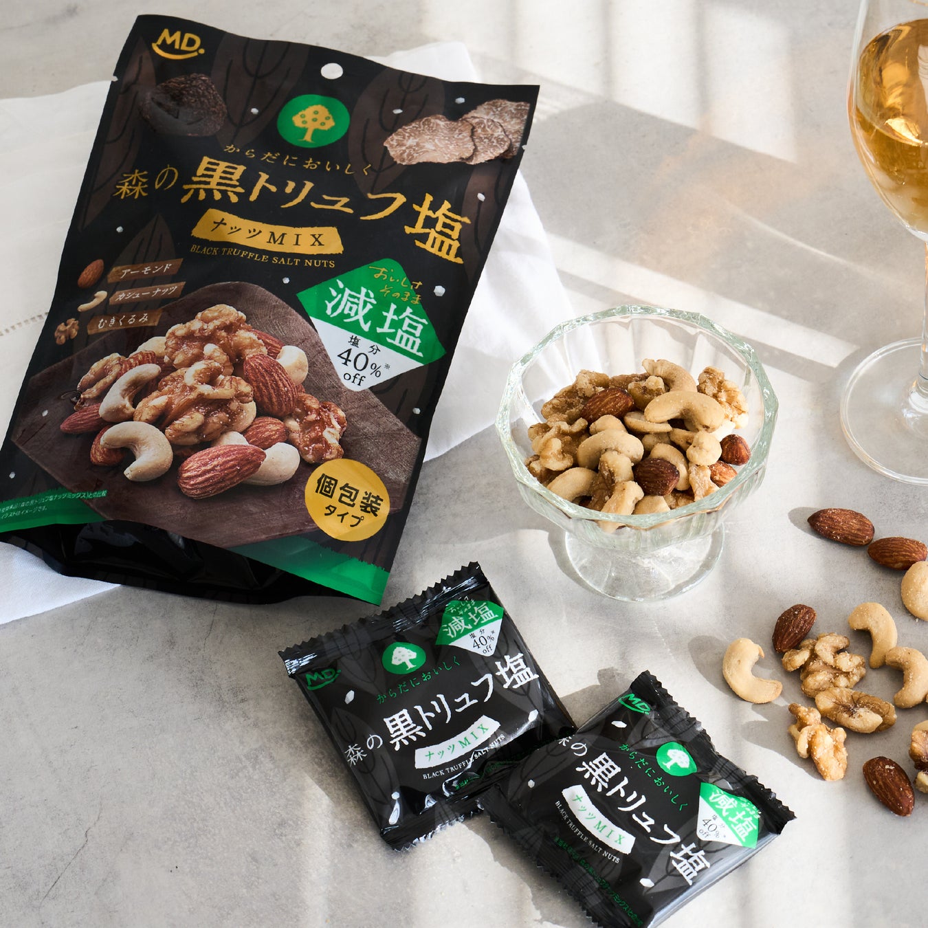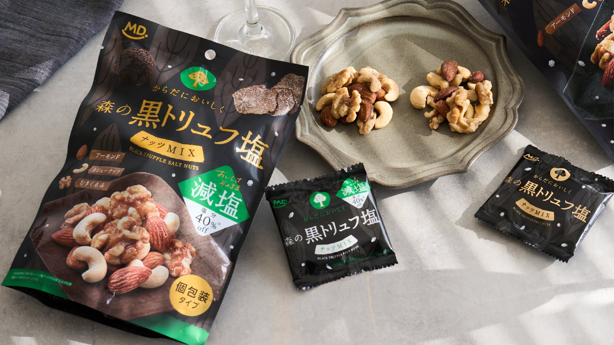 株式会社MDホールディングス(本社:大阪府東大阪市)は、発売から累計出荷数530万袋を突破した『森の黒トリュフ塩ナッツミックス』の姉妹品として、従来品から塩分を40%カットした『森の黒トリュフ塩ナッツミックス 減塩』を、2025年3月3日(月)より、全国で発売いたします。